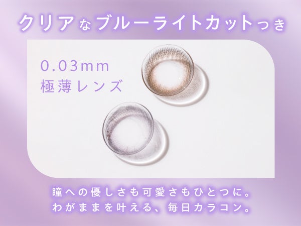 従来のブルーライトカットレンズは黄みを帯びているものが主流でしたが、無色透明レンズでブルーライトもUVもカットでき、さらに国内ワンデーで最薄の0.03mm極薄レンズでまるで裸眼のような快適なつけ心地というハイスペックさ。