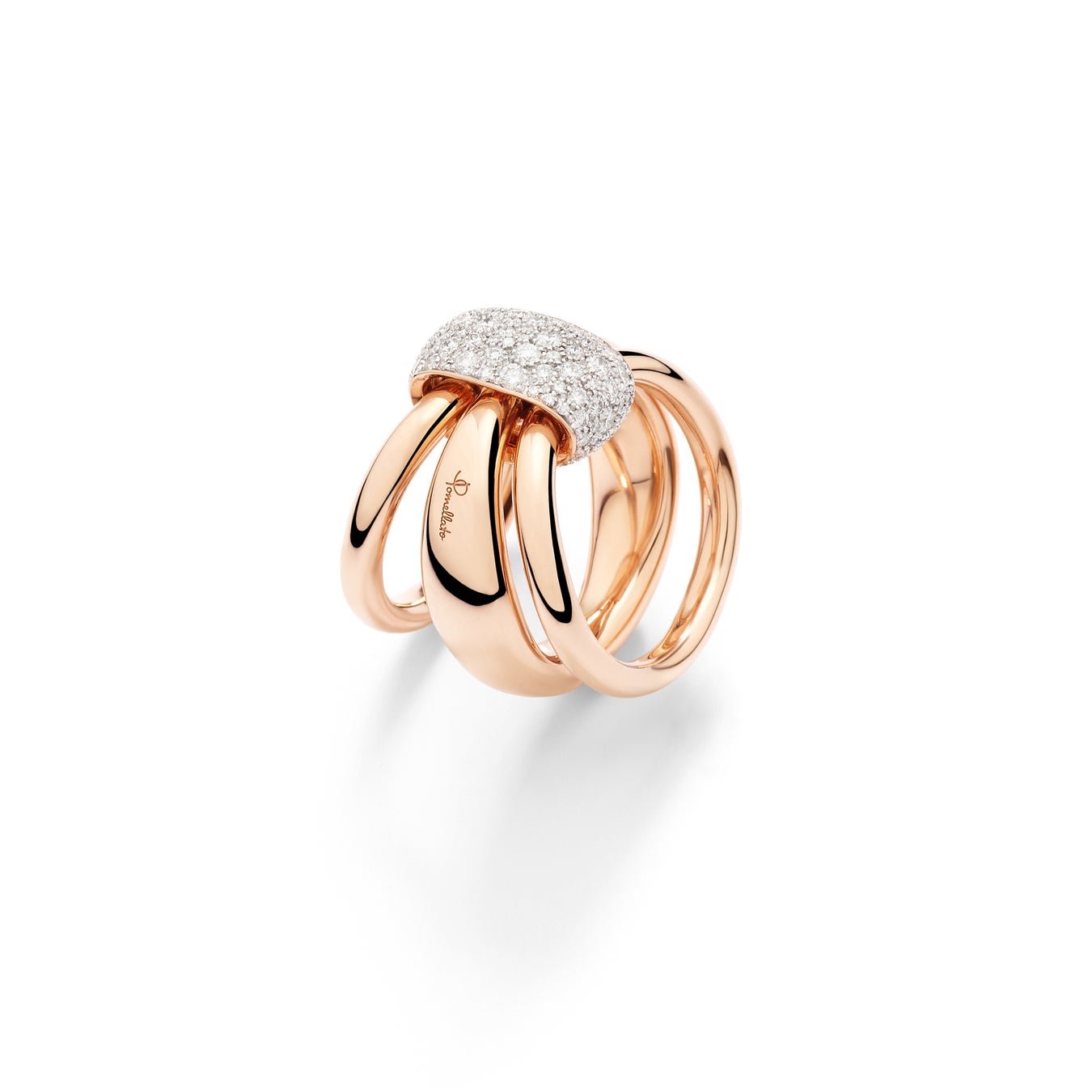 彫刻的でセンシュアルな魅力を放つ新作リングは、磨き上げたローズゴールドのバンドが、ホワイトダイヤモンドのイレギュラーパヴェをあしらったリンクによって包み込まれるデザイン。ダイヤモンドは単なる装飾ではなく、想いを照らす光として描かれています。その輝きは感情をきらめかせ、意味を深めるように寄り添います。リングの構造は美しい躍動感を宿し、3本の独立したゴールドバンドが中央