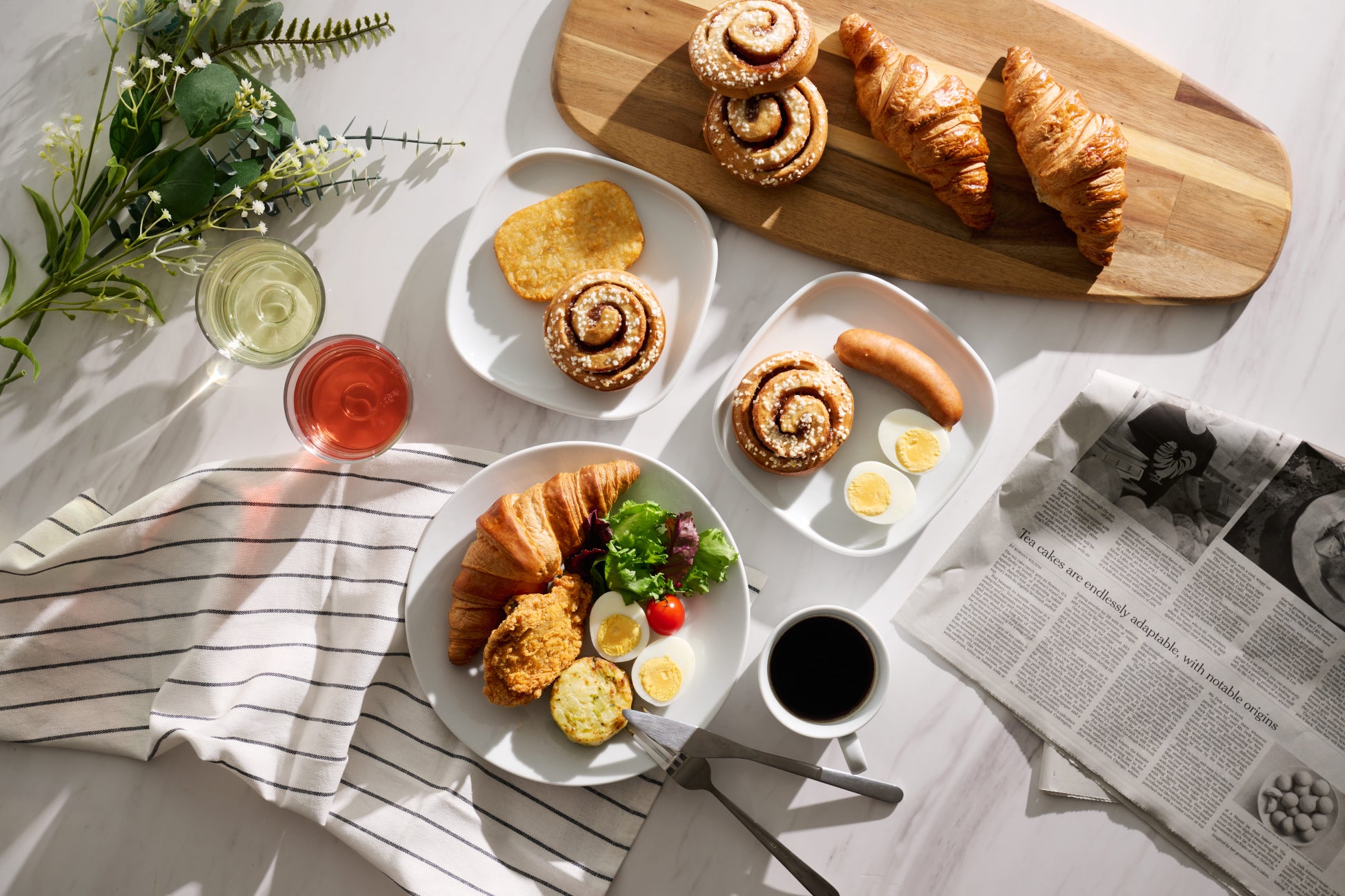 クロワッサン、ゆで卵、サラダにお好きなサイドメニューをふたつお選びいただけます。クロワッサンに挟んで、自分オリジナルの朝食としてもお楽しみいただけます。