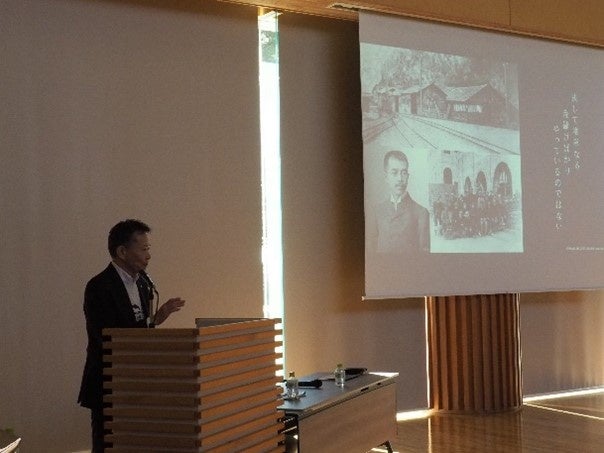 また、執行役副社長の德永俊昭より、社会イノベーションの挑戦の歴史、昨年12月に始動した創業の地日立市との共創プロジェクトの進捗状況などの紹介を通じて、創業の精神が110年以上にわたり大切に引き継がれていること、日立グループというアイデンティティ維持やグローバル成長の礎になっていることをご説明しました。グローバル視点でのメッセージとして、2021年7月に日立グループの一員となったGlobalLogicの取締役会長Shashank Samant(シャシャンク サマント)が、創業の精神に触れた当時の想いやGlobalLogicの企業文化とのシンパシーなどについて語ったビデオを上映しました。彼自身がオリジンパークを訪れた日のことも振り返り、その時に感じた熱い想いや決意についても語っています。