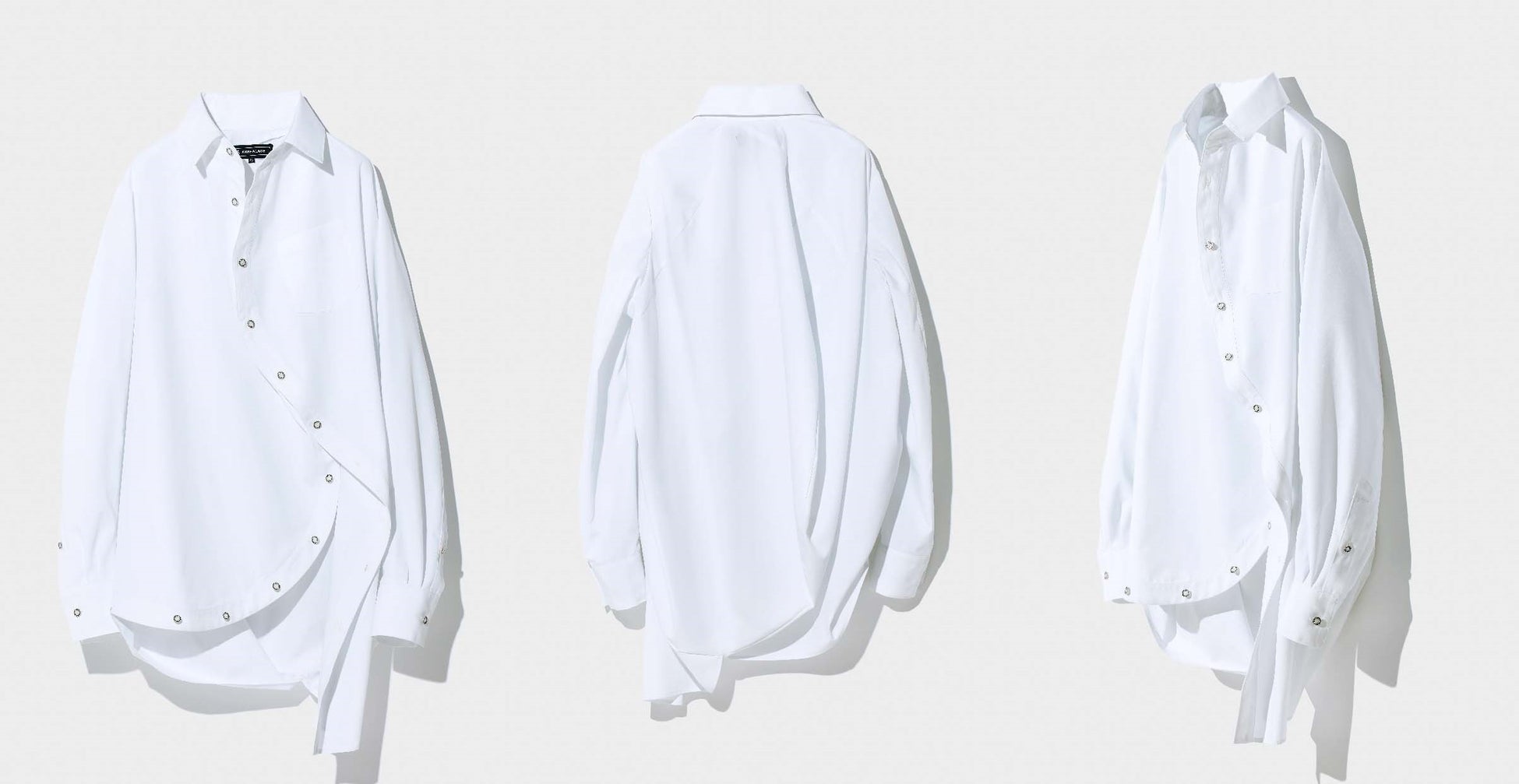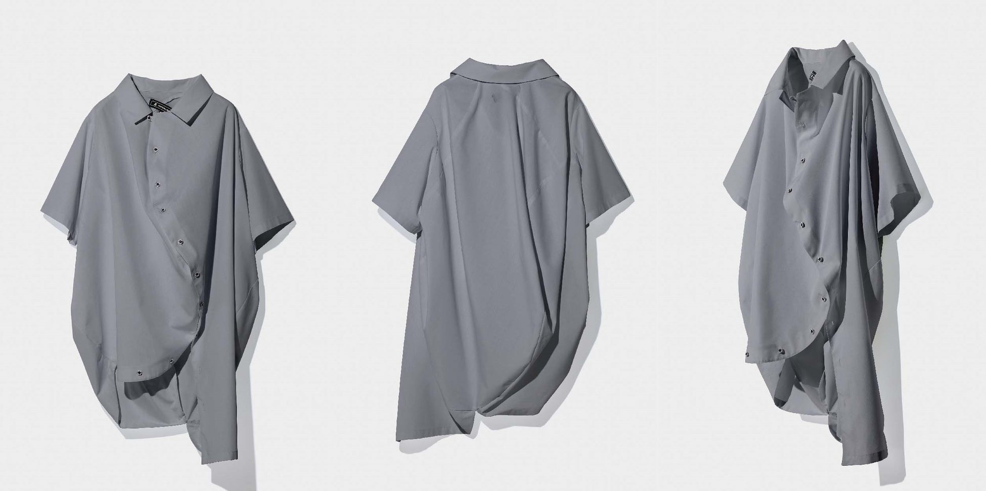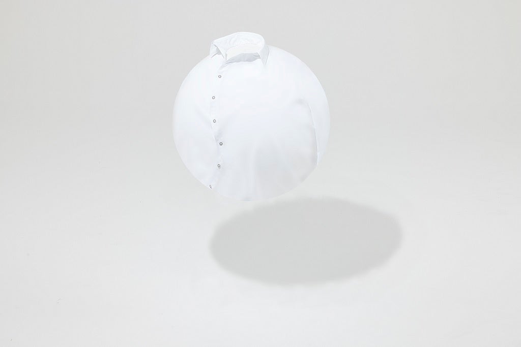 前立てボタンの開け閉めで、球体を象徴するシルエットやアシンメトリーな表情の変化を楽しめるシャツ。