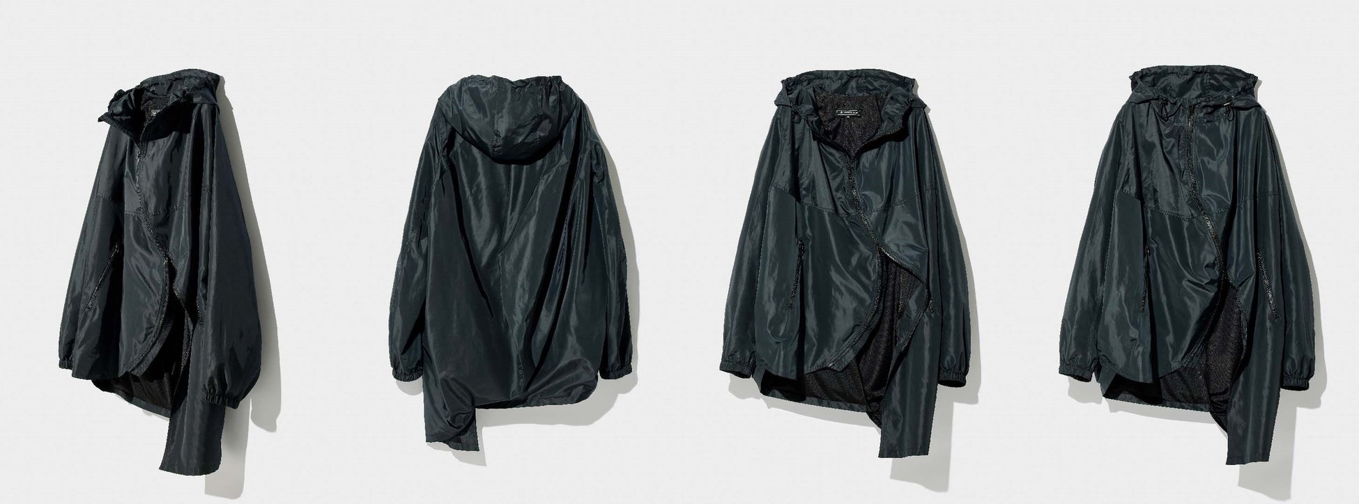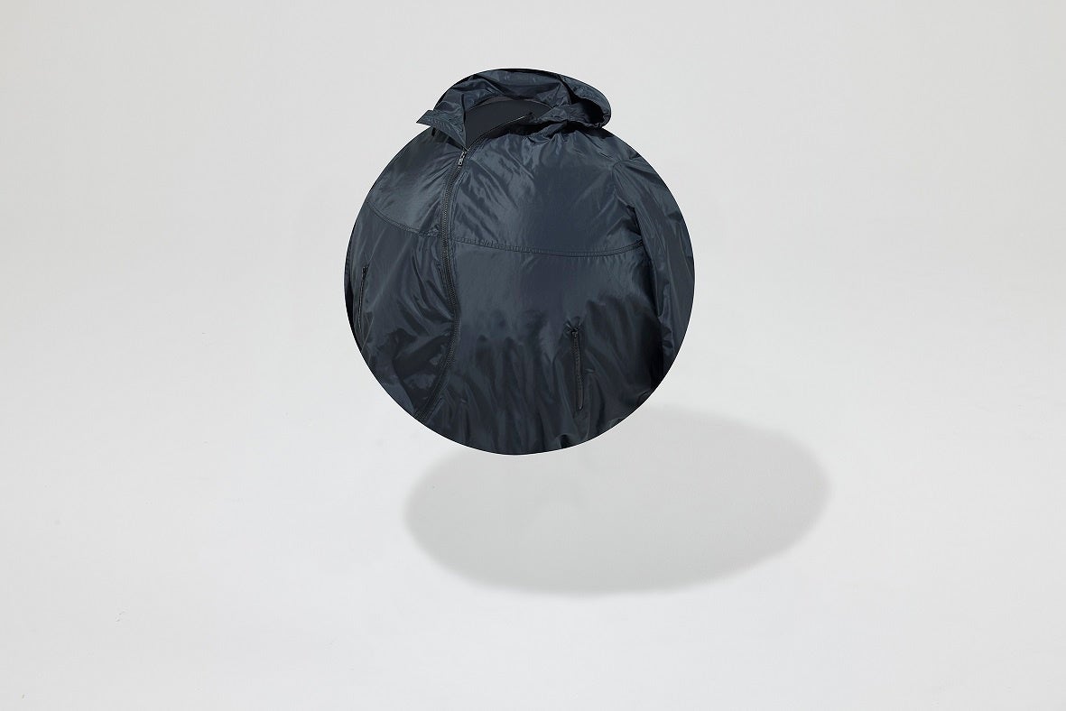 両開きに対応したフロントファスナーで、シルエットの調整が可能。軽量のポリエステル素材を採用した、