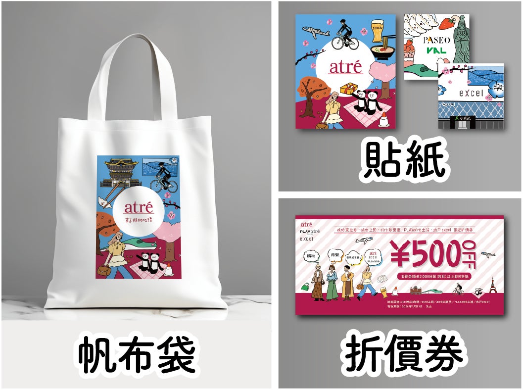 アトレブースにご来場いただき、アンケートにご回答いただいた皆様に、アトレ・パセオ・バル・エクセルオリジナルノベルティグッズをプレゼントいたします。今回のために、台湾人イラストレーターの方に書き下ろしていただいたイラストを使用したトートバッグやステッカーに加え出展7館限定で使用できるクーポン券を配布予定です。
