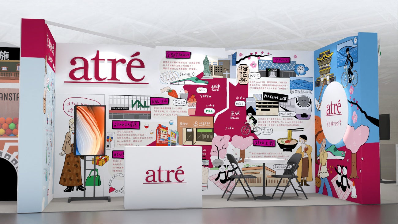 アトレブースでは、来場者にむけて、アトレ4館(恵比寿店、上野店、秋葉原店、土浦店)に加え、宇都宮パセオ、バル小山、水戸エクセルを含めた7館の紹介を行うほか、台湾人イラストレータによる似顔絵イベントや3Dアバター体験、オリジナルノベルティの配布を行い、来場者が訪日する際に日本での滞在をより豊かにする情報をブースで展開予定です。ぜひ、アトレブースにお立ち寄りください。