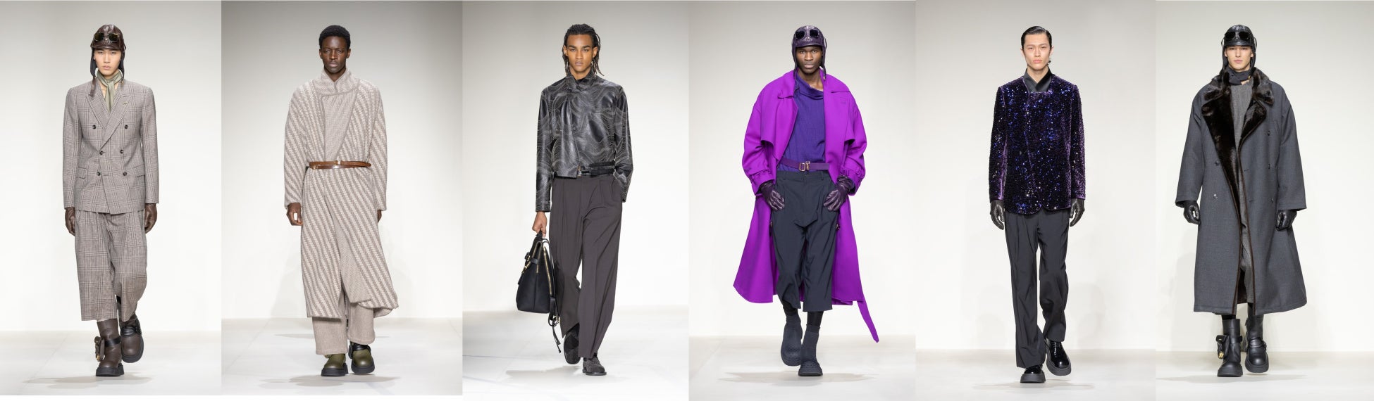 色彩のパノラマは、グレイジュ、ベージュ、キャラメル、ラスト(錆色)とトーンを変化させ、色彩の閃光のような強烈なレッドからパープルのニュアンスを持つゼラニウム、そしてブラックで完結します。そしてこのアビエーターにはロンググローブ、ビーニー帽、ダッフルバッグ、ドローストリングバッグが欠かせないアイテムとなっています。