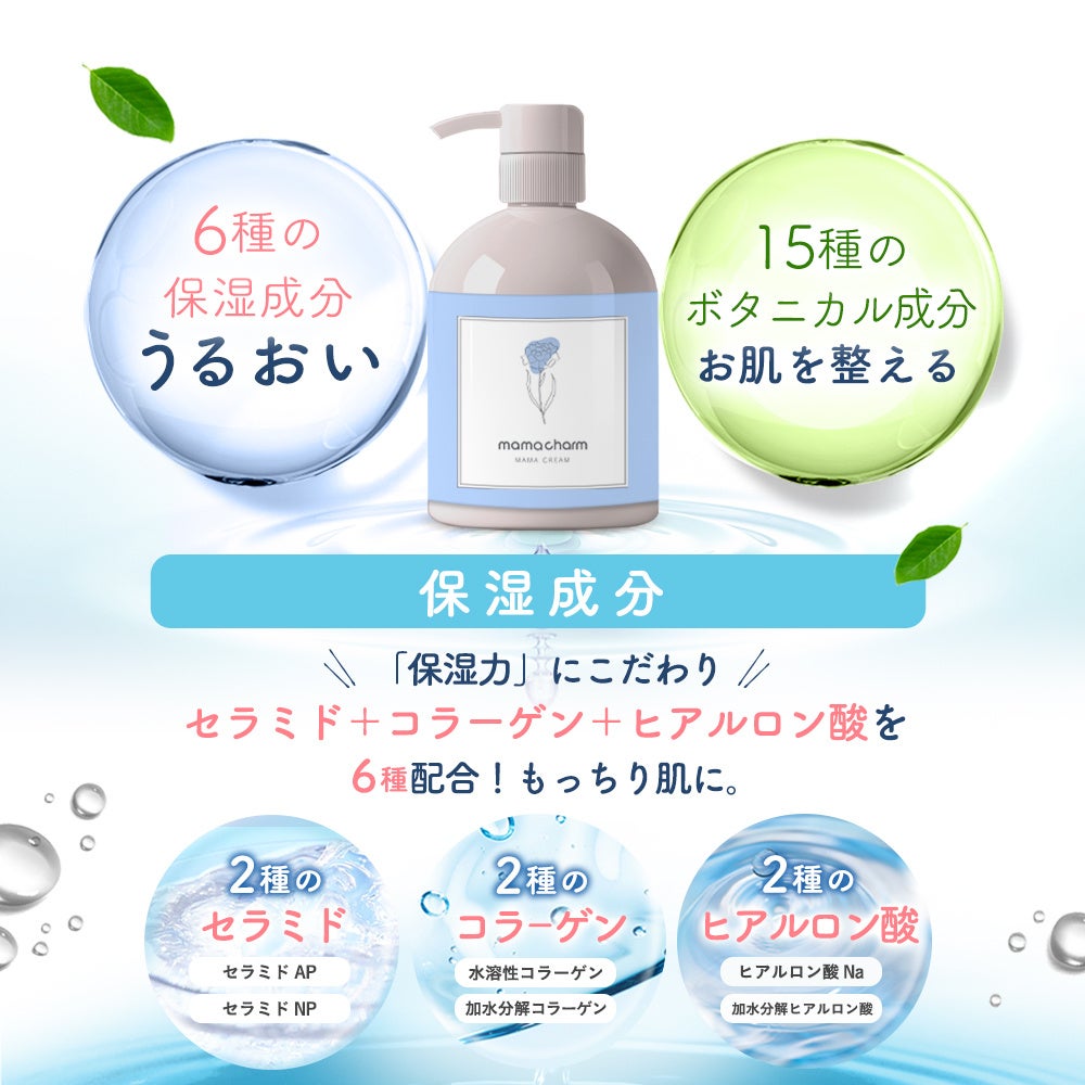 セラミド、MCTオイル、ヒアルロン酸、コラーゲン、シアバター、スクワランなど豊富な美容保湿成分を贅沢に配合しています。これにより、乾燥しやすい妊娠中のお肌や赤ちゃんのデリケートな肌にも、しっかりとうるおいを与えます。
