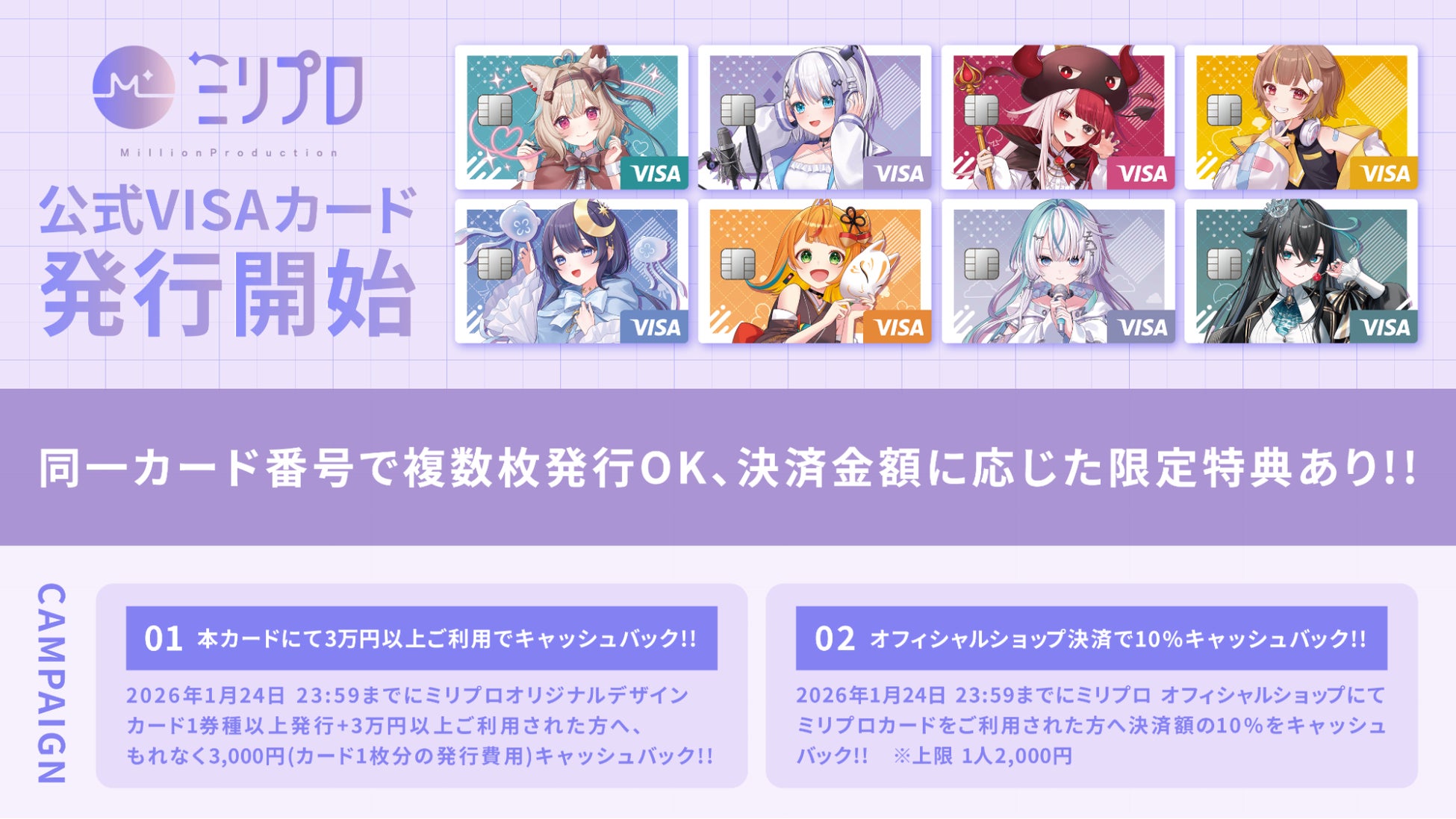 本カードは、日常の買い物を通じて「Million Production」を応援できる仕組みで、カードの月次利用額に応じて「Million Production」が提供する限定特典や、全8種を展開するオリジナルデザインカードをお楽しみいただけます。