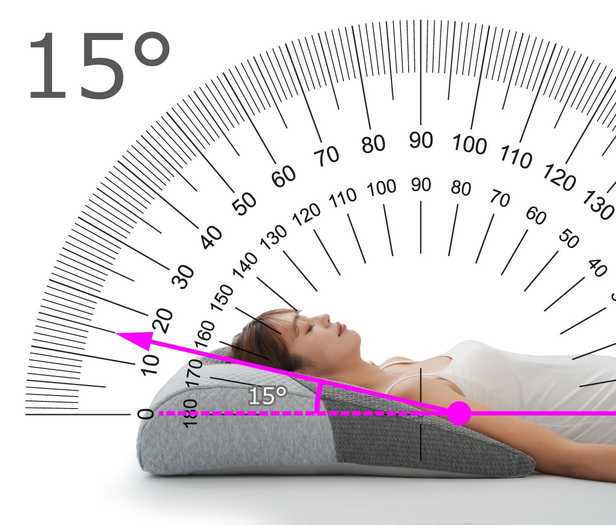 また、寝たときの体の角度が約15度近くになるように設計しています。枕から布団への段差を抑えることで違和感を感じにくく、気道が確保され呼吸のしやすい角度になっています。