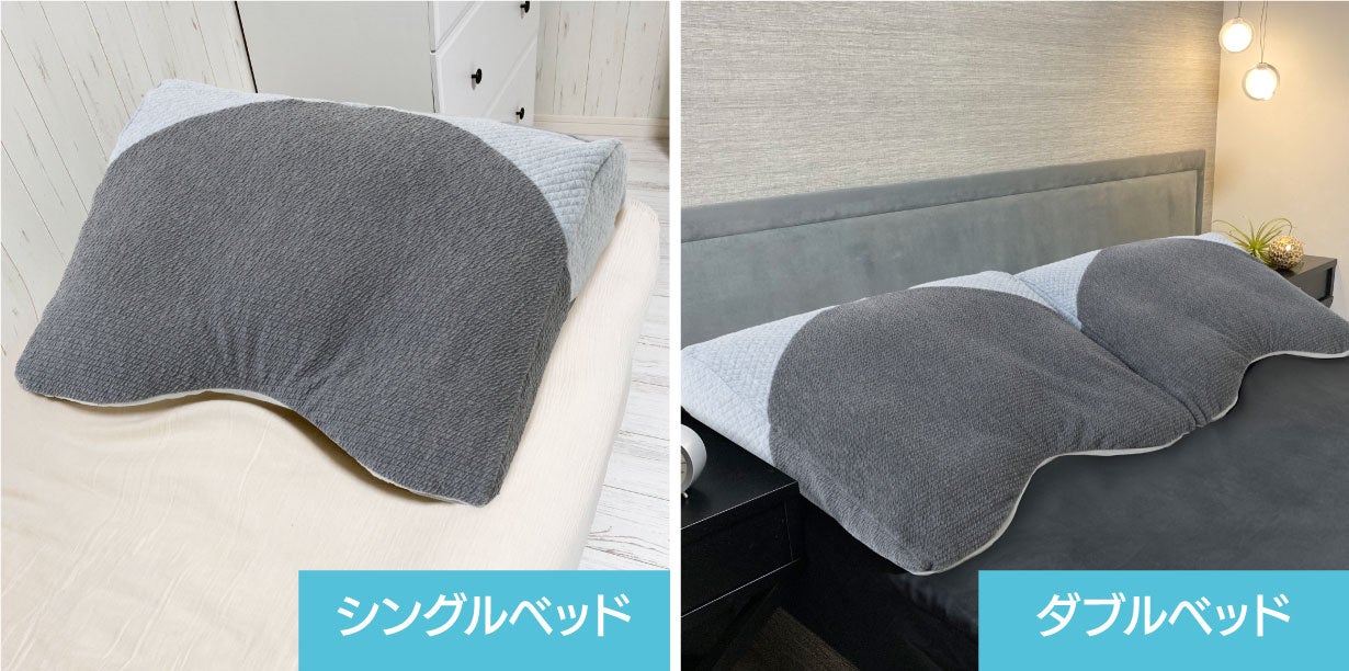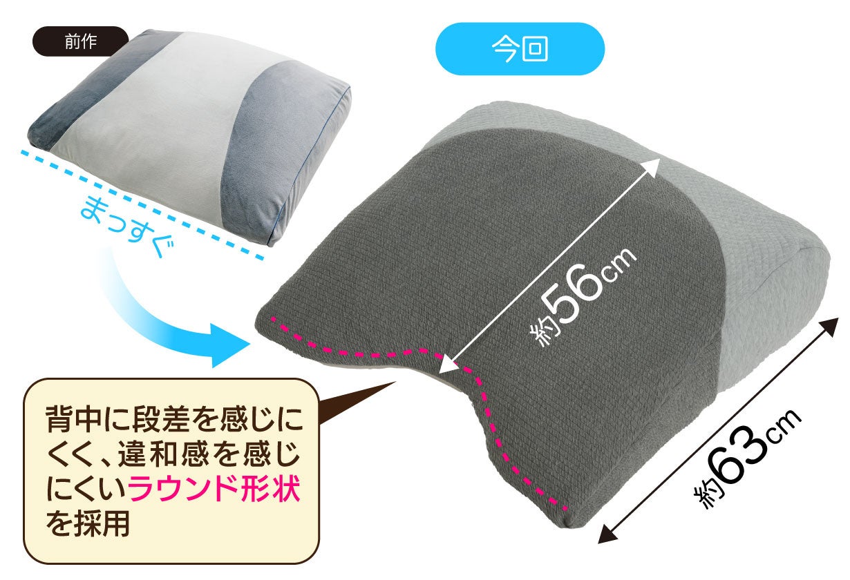 枕の中心部分を前作より約7cm短くすることにより、中材が程よく両側に移動することで、背中の凹凸にフィットしやすく、布団と背中が水平に近い状態となる為、枕と布団の段差などの違和感を感じにくくなりました。