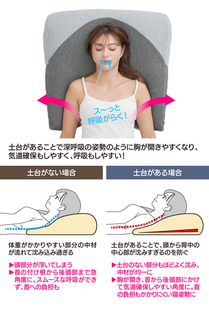「超熟プレミアム深呼吸枕」には、背中の中心部にのみ施されたウレタン製のクッションを「土台」として採用しております。