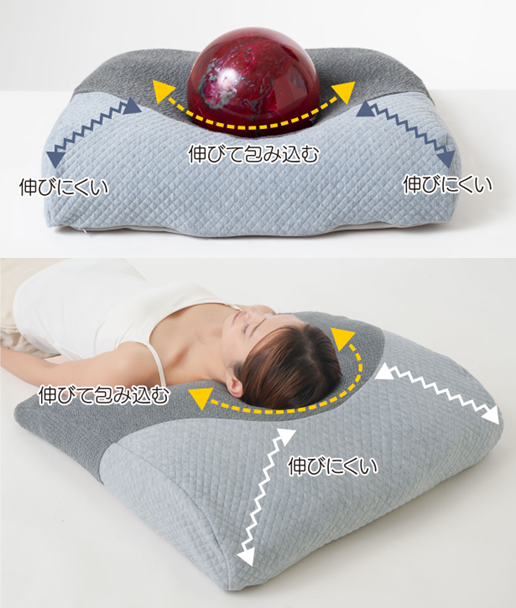「超熟プレミアム深呼吸枕」は、伸縮性の高い生地と伸縮性の低い生地を組み合わせたカバーとなっています。