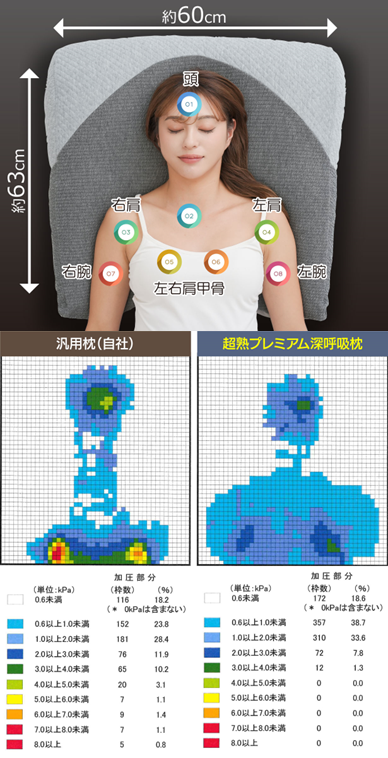 「超熟プレミアム深呼吸枕」は、(約)奥行63cm×幅60cmと「体の約30%」を包み込むビッグサイズで、頭・首・右肩・左肩・右上腕・左上腕・右肩甲骨・左肩甲骨の8カ所にすき間なくフィットする為、高い体圧分散性を実現しました。