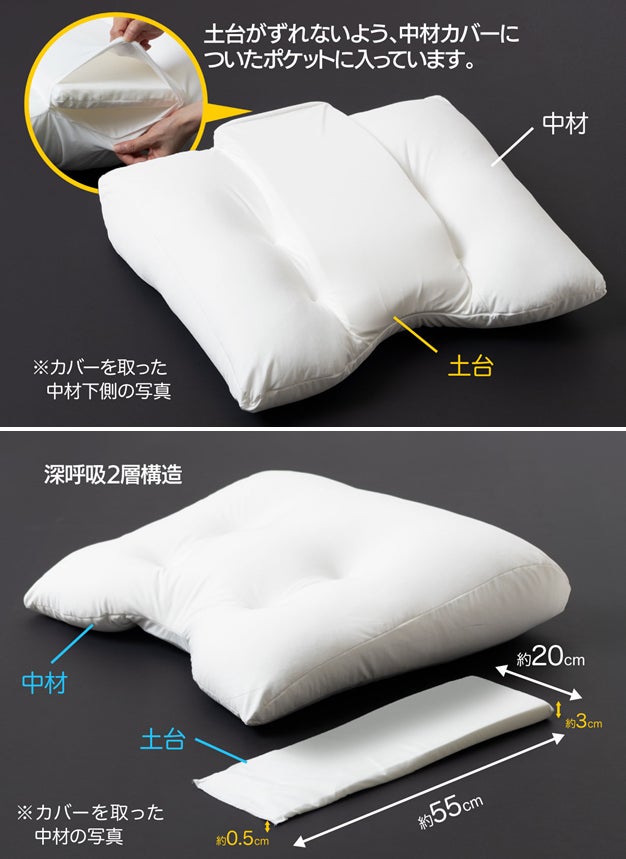土台のサイズは幅約20cm×長さ約55cm、頭側の高さ3cm⇒背中側の高さ0.5cmのなだらかな傾斜となっています。この土台と中材が合わさった「深呼吸2層構造」に大きな特徴があります!