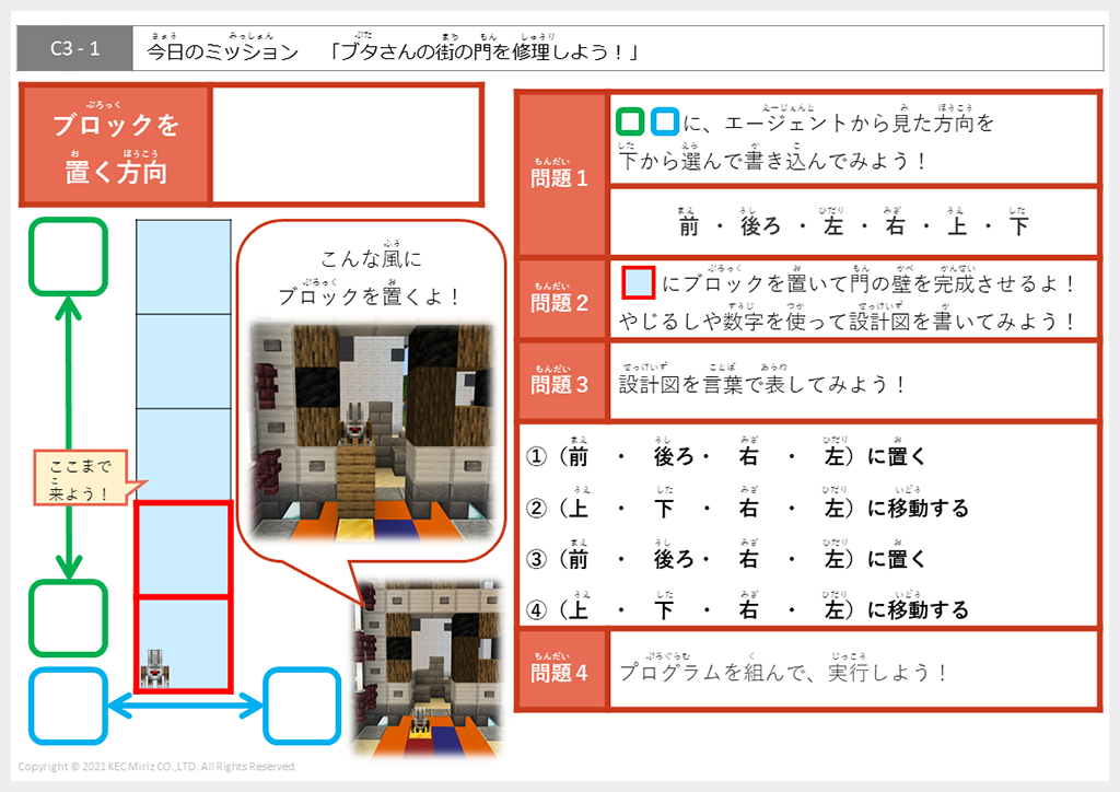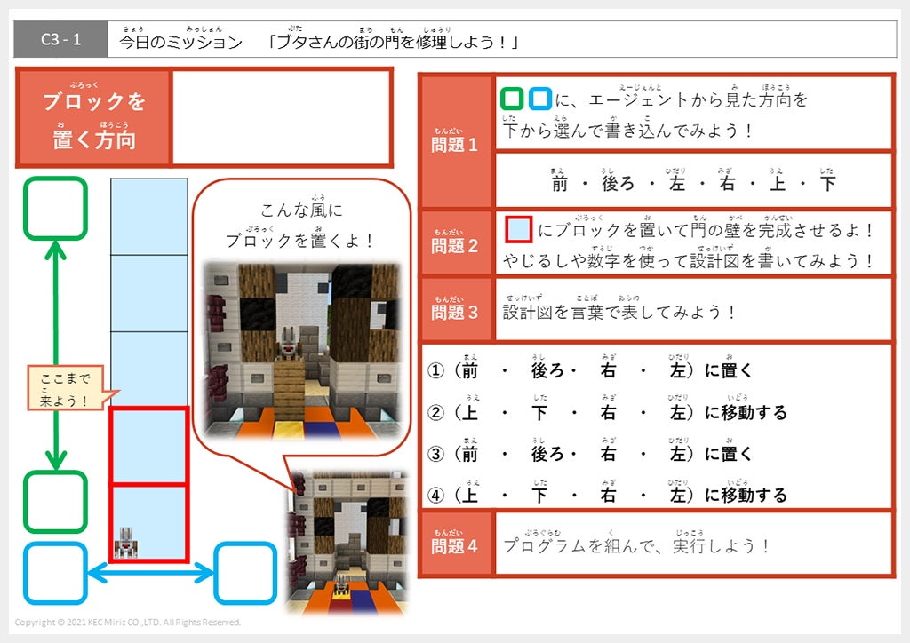 本講座は、問題の内容を理解し、解答までの計画を組み立てて図や文字に起こすところからスタートします。そのうえで、ゲーム内のキャラクターの動きをプログラミングし実行させ、間違っていた場合は再度計画を練り直すことになります。この一連の流れを通して、「問題解決能力」を身につけることができます。