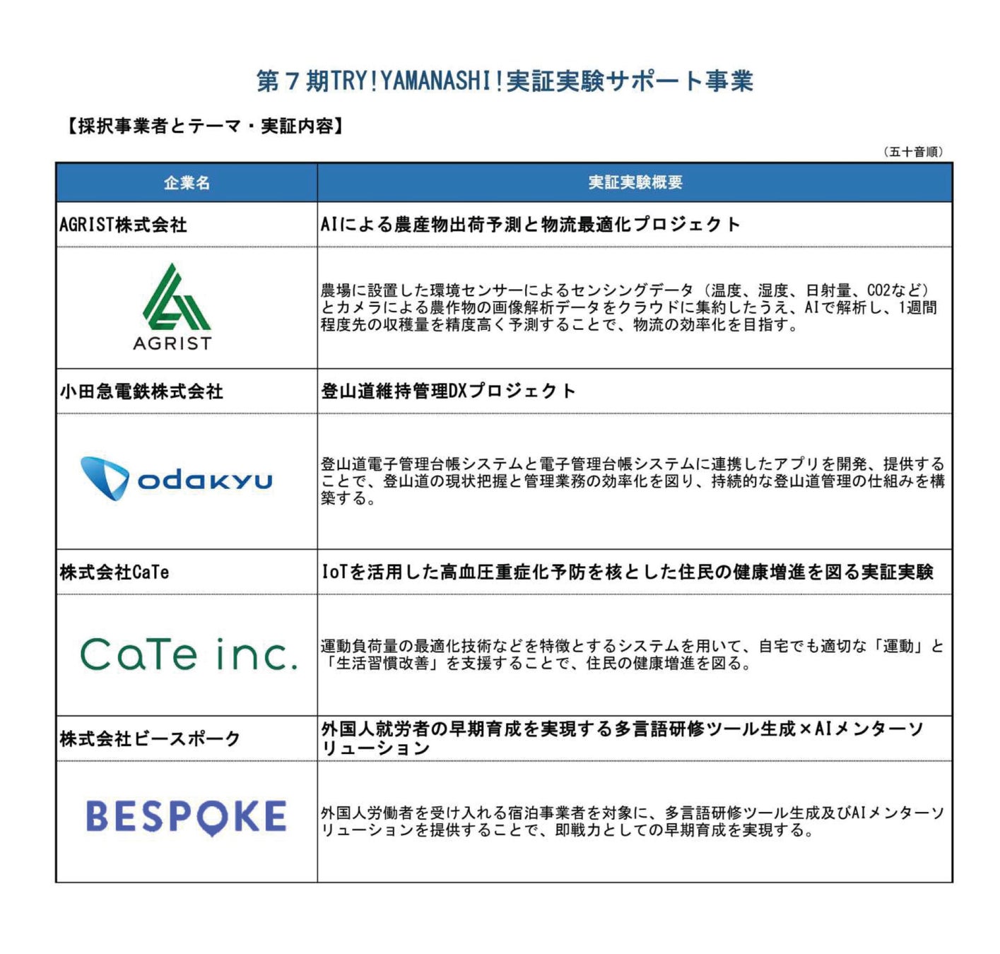 山梨県(知事:長崎幸太郎)が実施している、最先端技術やサービスを有するスタートアップ企業等に伴走し、山梨県全域を対象にした実証実験を全面的にサポートする「第7期TRY!YAMANASHI!実証実験サポート事業」において、8月29日に二次審査を行い、応募総数45社の中から4社を採択しました。