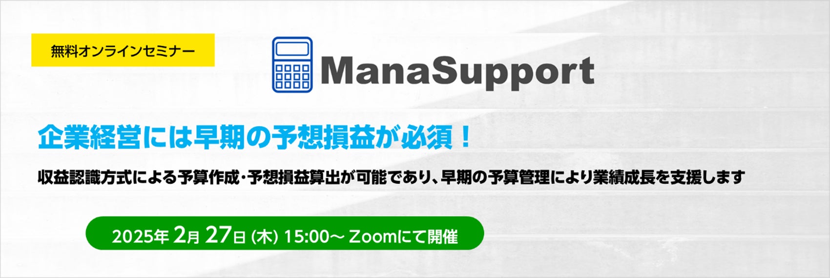 株式会社ニーズウェル(本社:東京都千代田区、代表取締役会長兼社長 船津浩三)は、2025年2月27日(木)15時より、無料オンラインセミナー「企業経営をサポートする予想損益シミュレーション「ManaSupport」~企業経営には早期の予想損益が必須!収益認識方式による予算作成・予想損益算出が可能であり、早期の予算管理により業績成長を支援します~」を開催します。