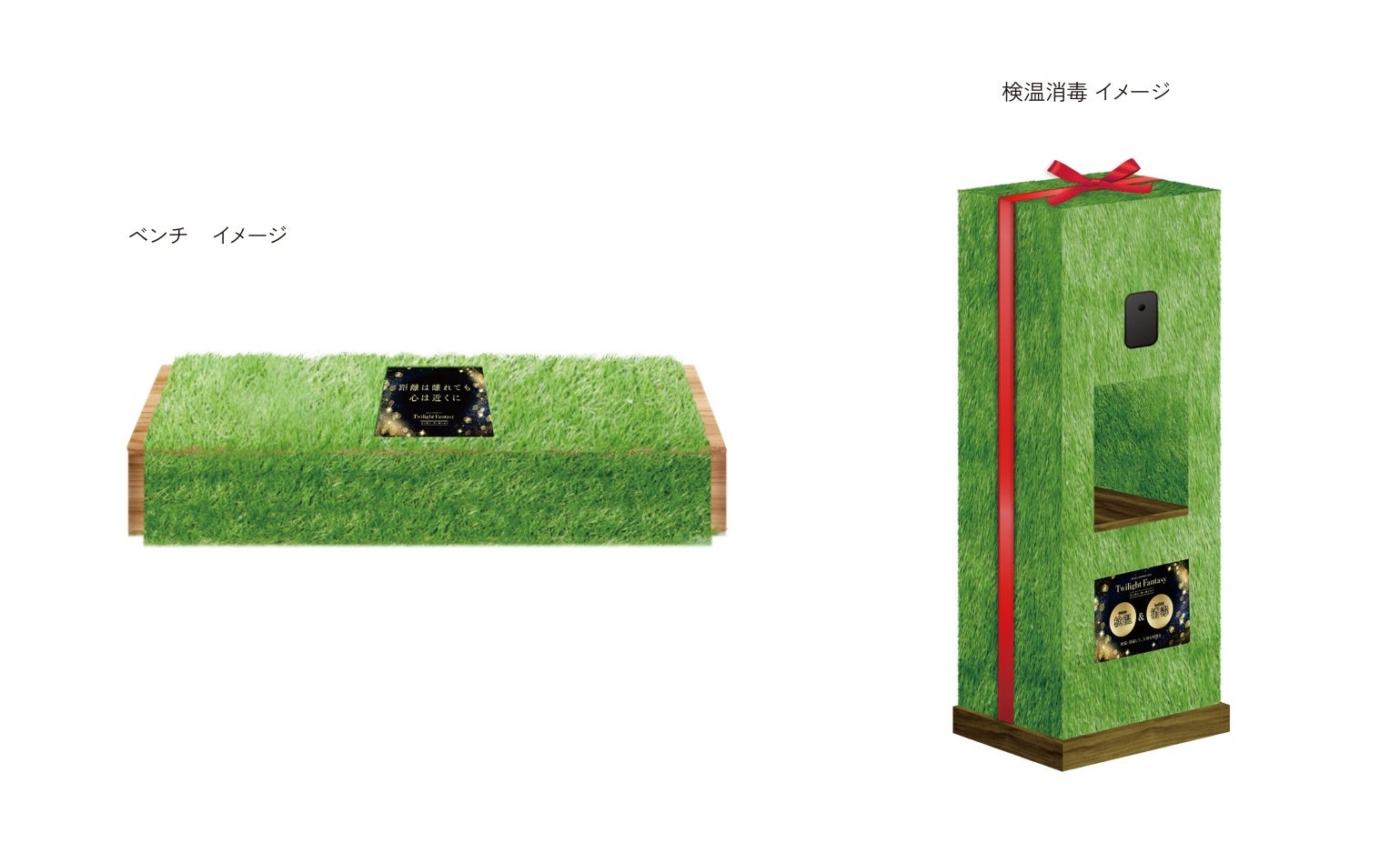 ご来場のみなさまに、安心してお楽しみいただけるようベンチでの距離を確保できるプレートや検温・消毒が出来るオブジェを設置します。