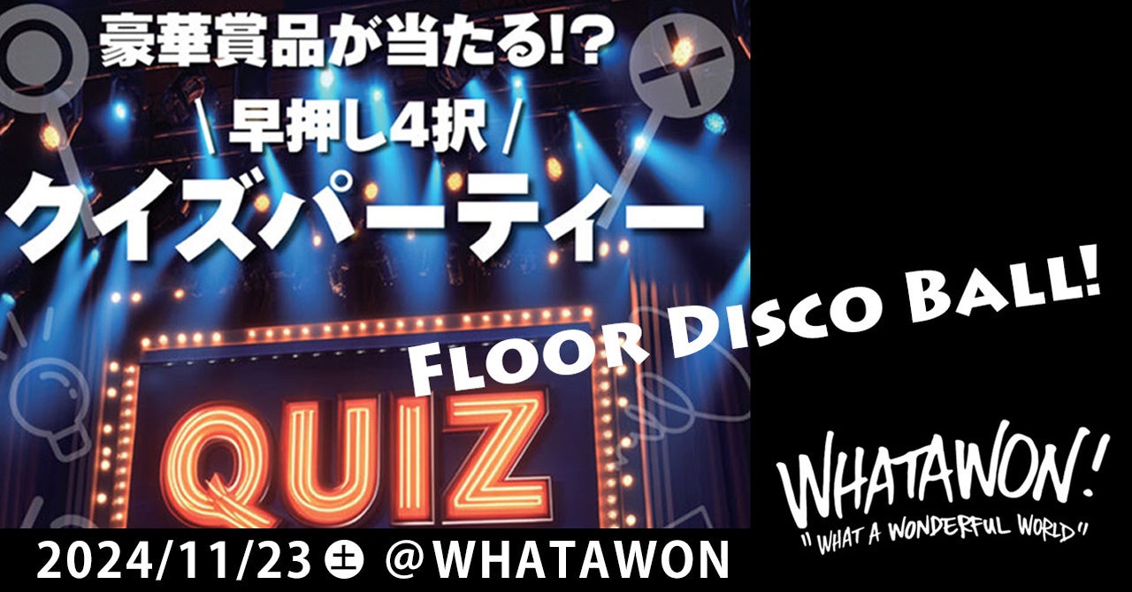株式会社antiqua(本社:大阪府和泉市)が手がける南大阪の滞在型エンターテインメントモール「WHATAWON(ワタワン)」のライブホール「Floor Disco Ball(フロアディスコボール)」にて、豪華景品が当たる『早押し4択クイズパーティー』を開催いたします。このイベントは、スマホやタブレットを使って参加する、小学生以上の方を対象にした子どもから大人まで楽しめるクイズ大会です!