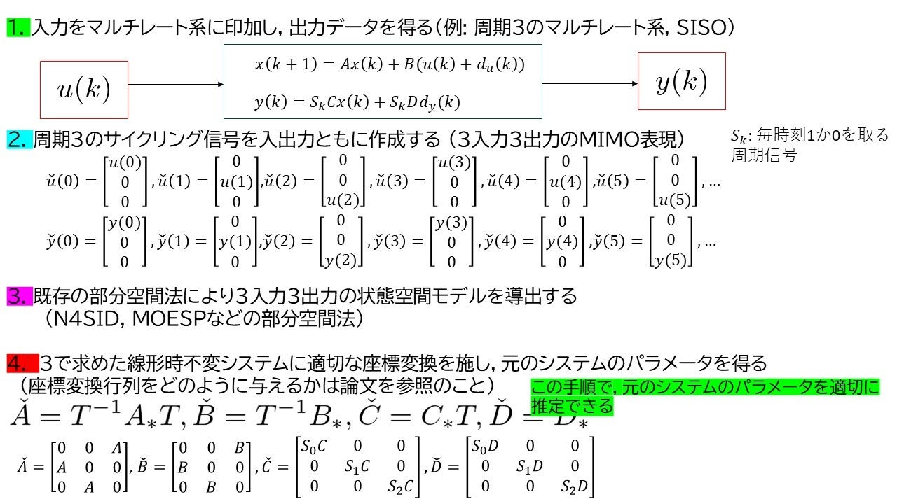 本研究では、サンプリング周期が異なる複数のセンサから得られる信号を用いて、制御対象の数理モデルを高精度に構築するシステム同定アルゴリズムを提案しています。マルチレートシステムを周期時変システムとして扱い、サイクリック再定式化手法により線形時不変系に変換することで、既存のシステム同定手法を適用可能にします。さらに、サイクリック構造の特性を利用した座標変換により、元のマルチレートシステムのモデルパラメータを導出します。