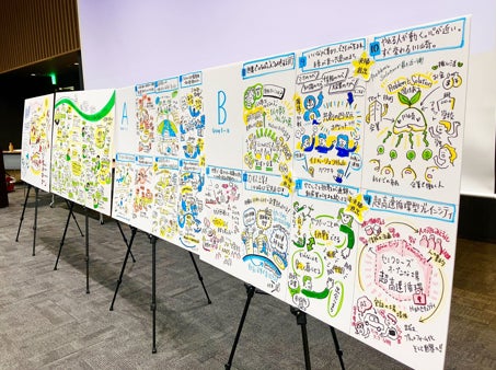 当日は、インプットトークやグループワークの経過、成果発表の内容などを、富士通(株)、(株)東芝に所属するデザイナー4名が、絵や図形などを用いてリアルタイムにビジュアル化する「グラフィックレコーディング」という手法により記録しました。グラフィックレコーディングは、下記の期間・場所において、来庁者に向けて展示いたします。