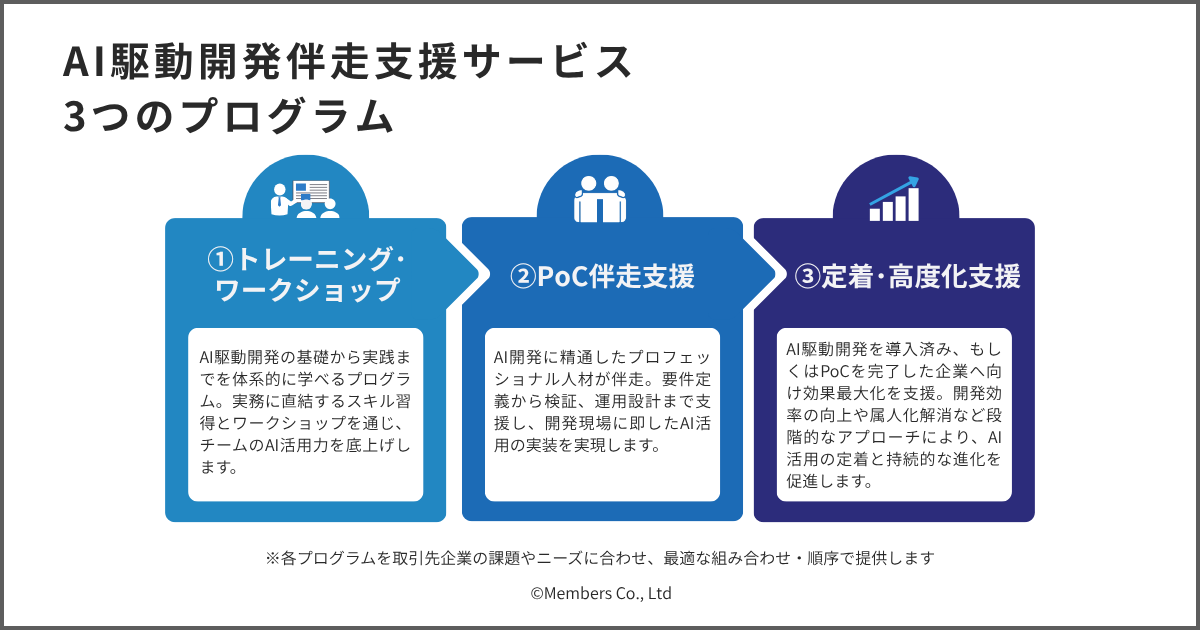 AI駆動開発への変革を「トレーニング・ワークショップ」、「PoC伴走」、「定着・高度化」の3つのプログラムで伴走支援し、企業のAI駆動開発における内製化を確立します。3つのプログラムを通じて、AIを便利な道具からパートナーへと進化させ、開発現場の生産性向上とビジネス変革実現のための、実践的な支援を提供します。