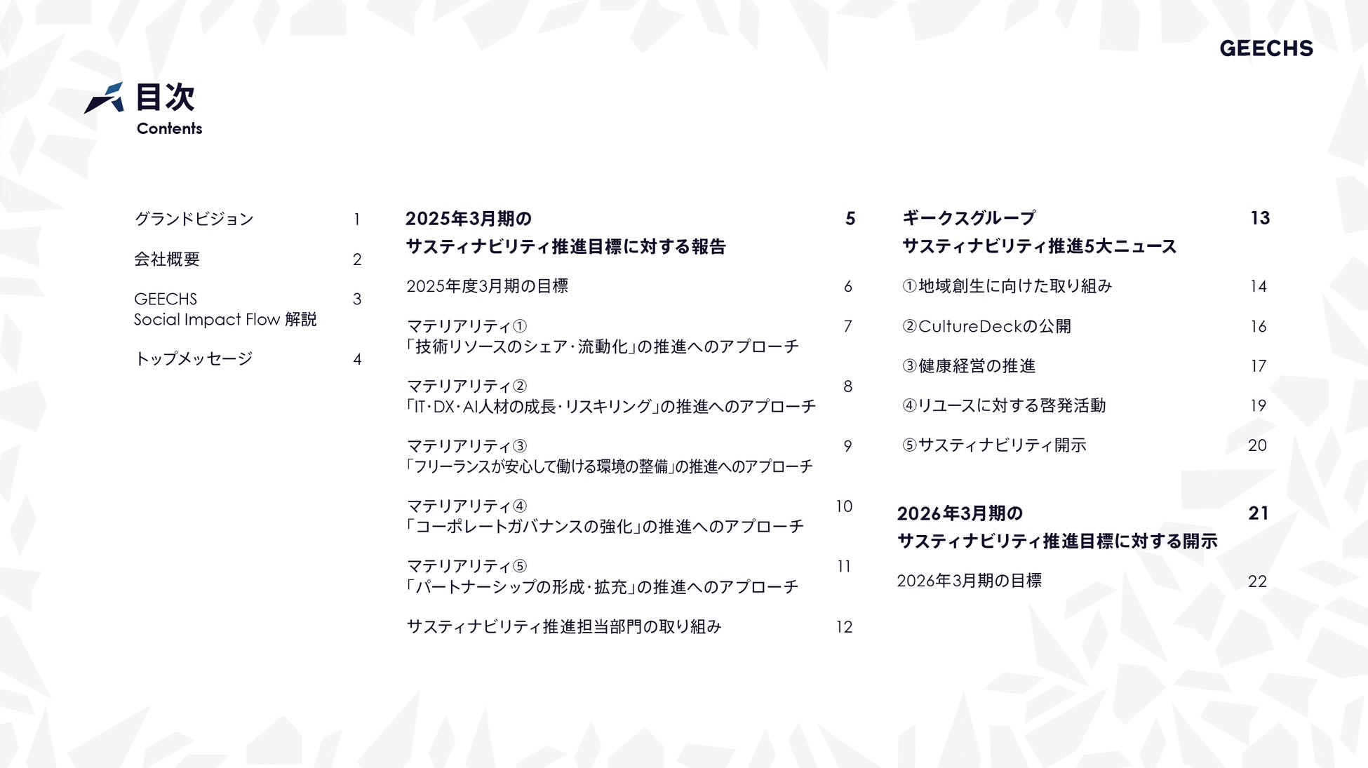 前年度に引き続き、読みやすさと信頼感のあるデザインやトーンにもこだわりました。本レポートを通じて、多くの方に「ギークスらしいサスティナビリティ推進」を感じていただければ幸いです。