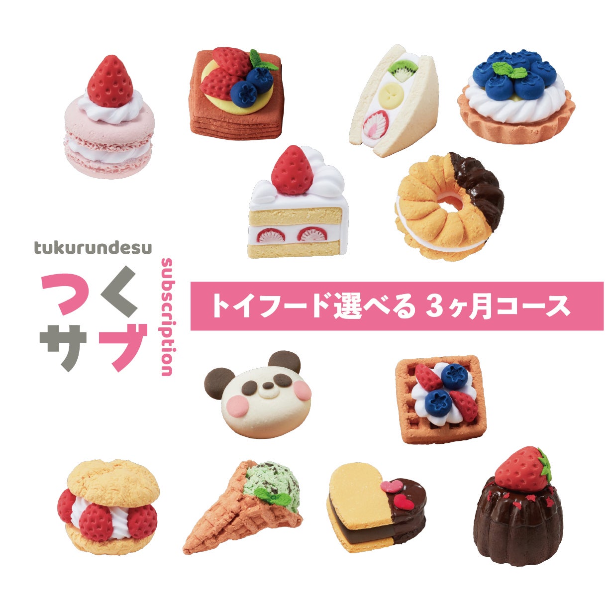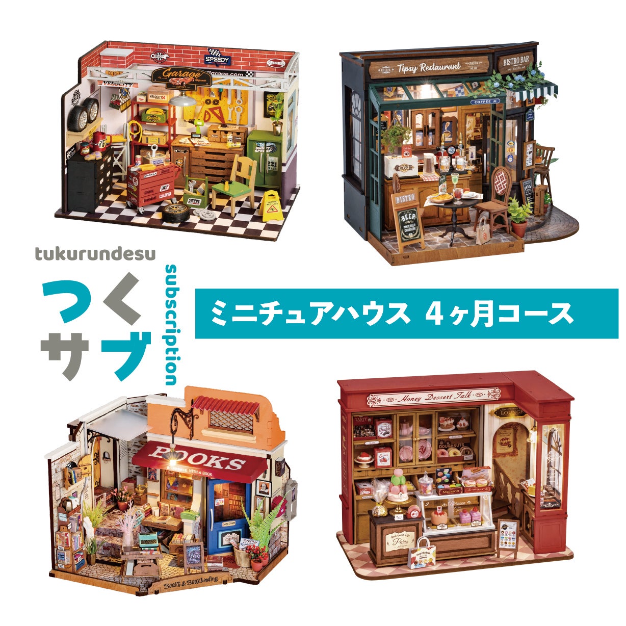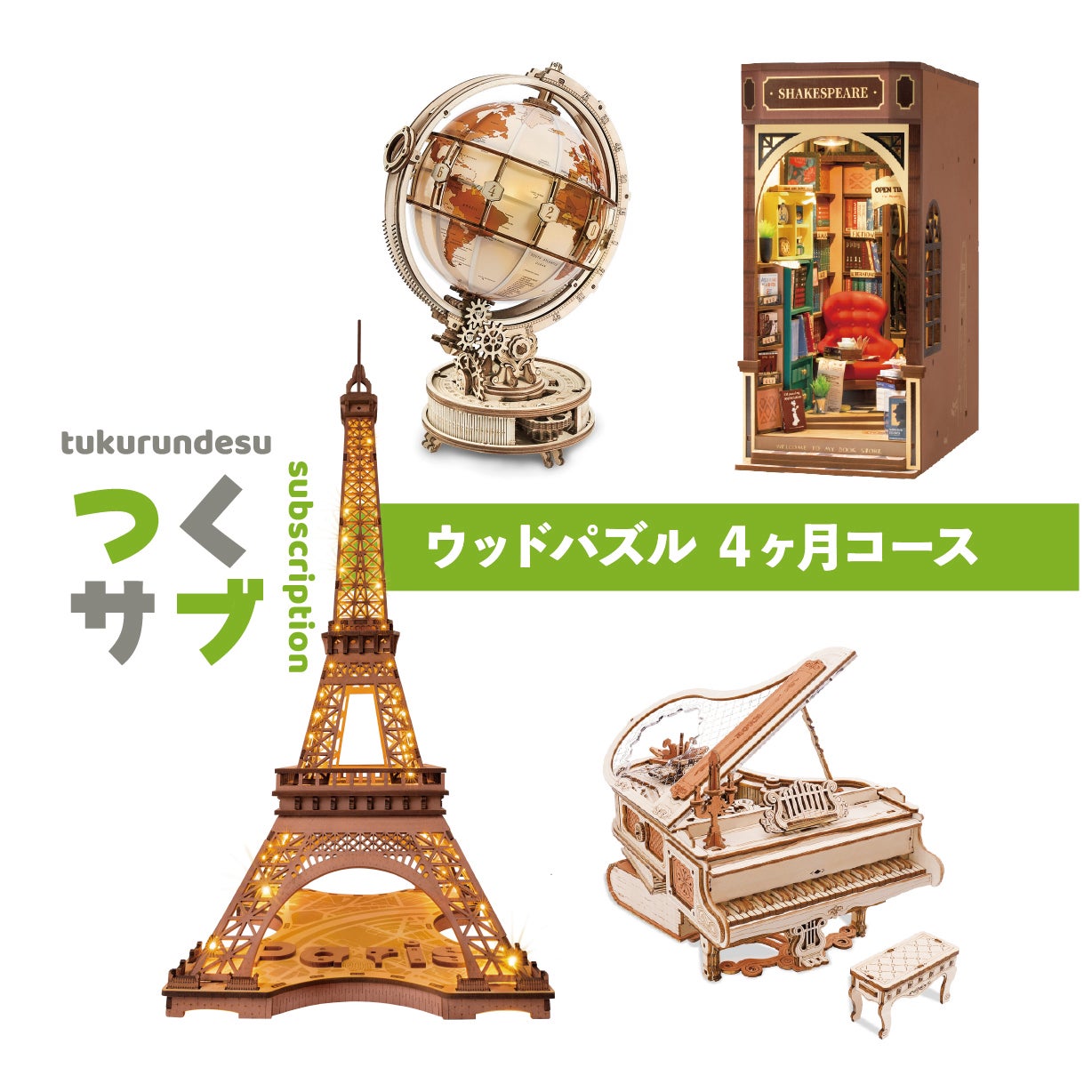 「つくるんです®」をもっと気軽に楽しんでいただけるよう、定額制サブスクリプションサービス「つくサブ」が、2025年6月よりスタート予定です。コースは、人気のミニチュアハウスが毎月届く「ミニチュアハウス4ヶ月コース」、バラエティに富んだウッドパズルが毎月届く「ウッドパズル4ヶ月コース」、選べる楽しさもプラスした「トイフード3ヶ月コース」の3つを予定しています。