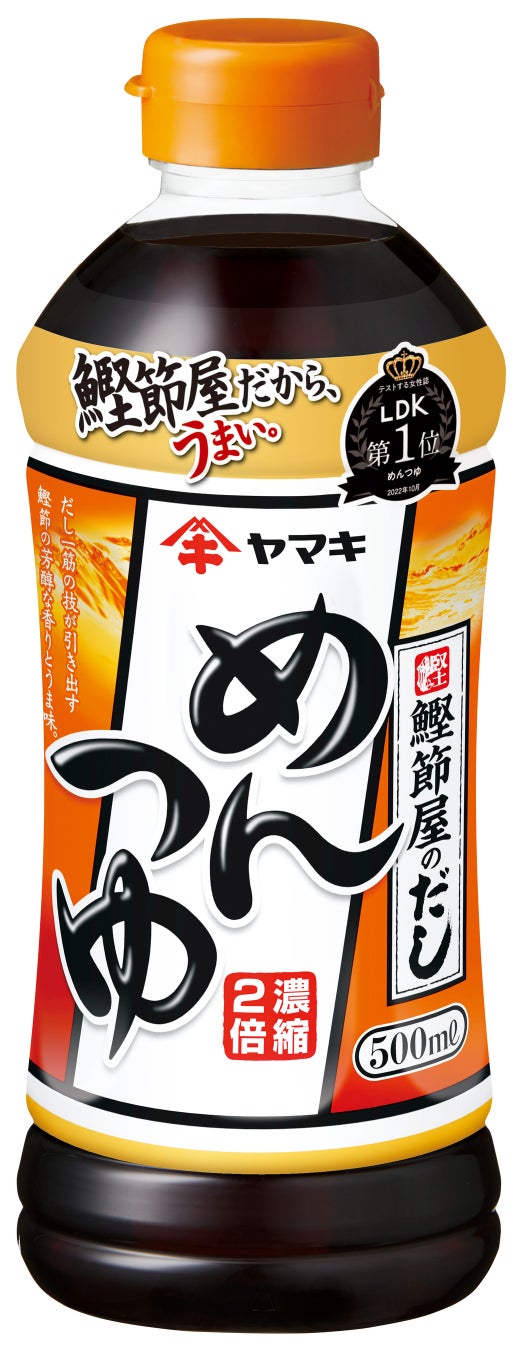 だし一筋の技により引き出された、かつお節の芳醇な香りと強いうま味の濃縮2倍めんつゆ。1979年の発売以来、多くのお客様にご愛顧いただいている、ヤマキの看板商品です。