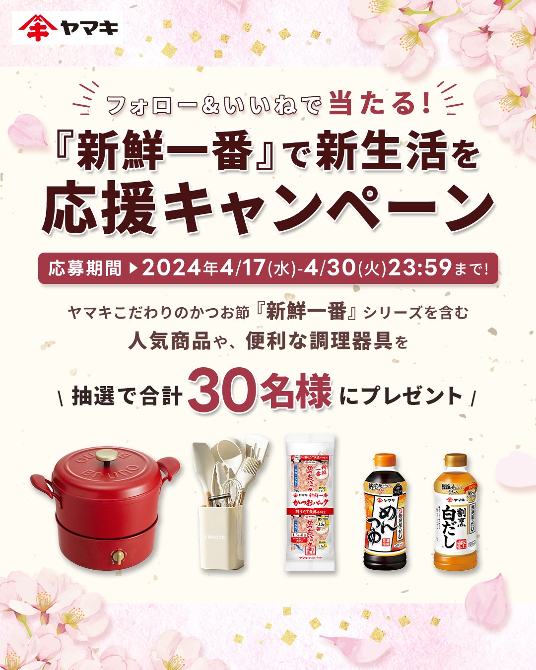 ご応募いただいた方から抽選で合計30名様に、「新鮮一番かつおパック1.5g×8P」に加え、「ヤマキ めんつゆ500ml」、「ヤマキ 割烹白だし®500ml」セットや、便利な調理グッズをプレゼントします。