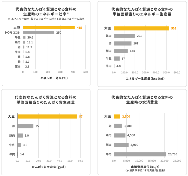 アミノ酸スコアが100である肉や魚と同様に、大豆たんぱく質は植物性たんぱく質の中で唯一、アミノ酸スコア100と評価されており、動物性たんぱく質と同様に必須アミノ酸をバランスよく含んでいる良質なたんぱく源であるといえます。大豆について詳しく知りたい方は下記をご覧ください。