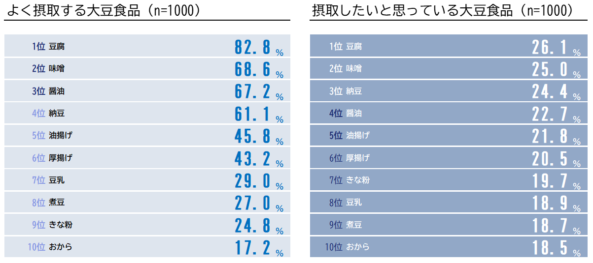 - よく摂取する大豆食品は「豆腐」82.8%、「味噌」68.6%、「醤油」67.2%に。