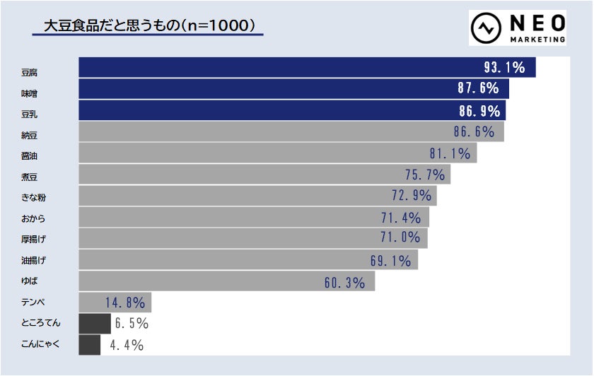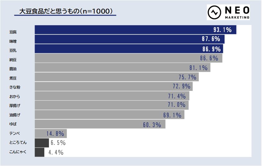 - 大豆食品だと思うものをお聞きすると、「豆腐」は9割以上、「味噌」や「豆乳」等も8割以上と高い数値に。