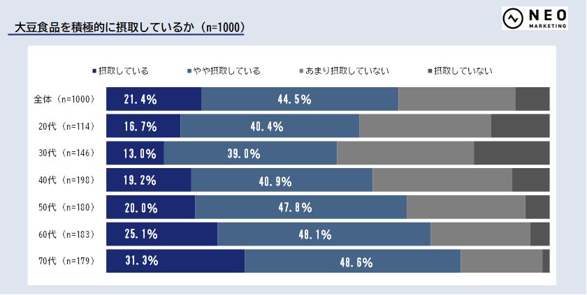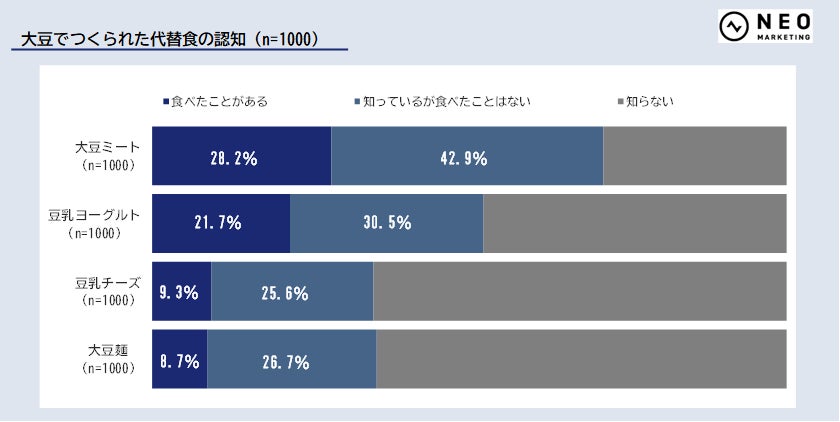 年代を重ねるにつれ大豆食品を摂取する傾向あり。大豆ミートや豆乳ヨーグルトの認知は半数以上、喫食経験は5人に1人が食べたことがあるという結果に