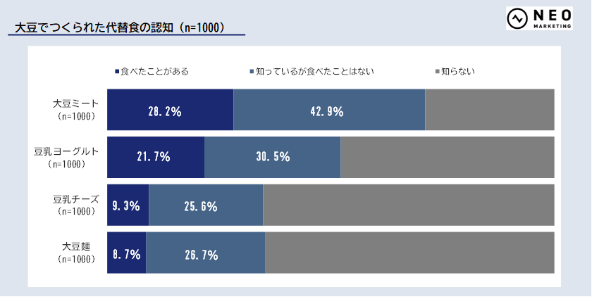 - 大豆ミート認知は71.1%、喫食経験は28.2%、次いで認知が高いのは「豆乳ヨーグルト」で52.2%と半数以上。
