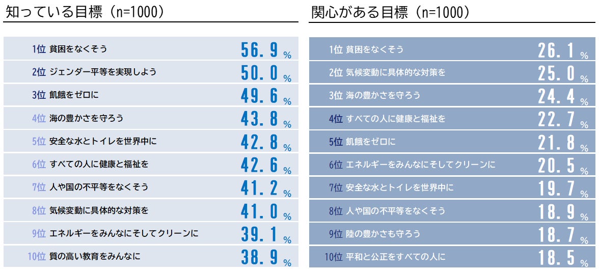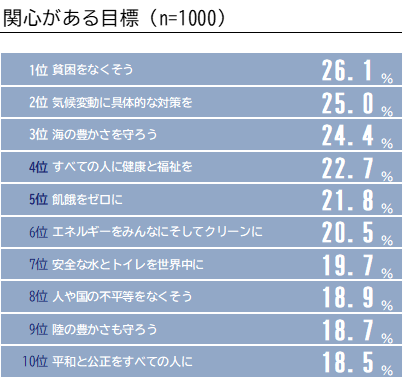 興味のある目標では、「貧困をなくそう」が26.1%で最も多く、次いで、「気候変動に具体的な対策を」25.0%と続きます。