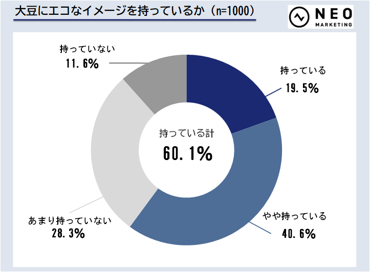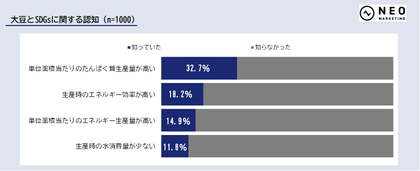 - 大豆に「環境にやさしいエコな食品」のイメージを6割以上が持つ一方で「単位面積当たりのたんぱく質生産量が高い」などの具体的な認知は32.7%と低い結果に。