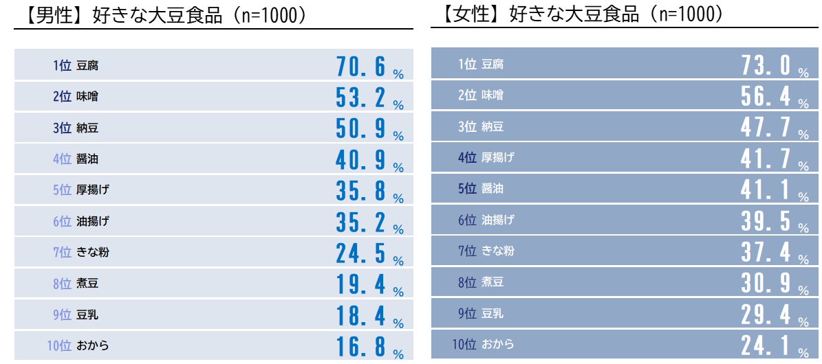 - 約7割が大豆食品を積極的に摂取していると回答。好きな大豆食品は、男女ともに「豆腐」、「味噌」、「納豆」という順。大豆食品は日本人にとって身近な存在であることが改めて良く分かる結果に。