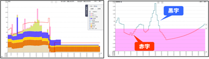 (ライフプランシミュレーションのイメージ)左図:1年毎の収支の流れ、右図:世帯の貯蓄の変化