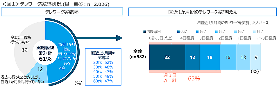 首都圏テレワーク実施率は49%、うち32%は「ほぼ毎日」 働く場所は「会社や現場」を中心としたい人が半数超え