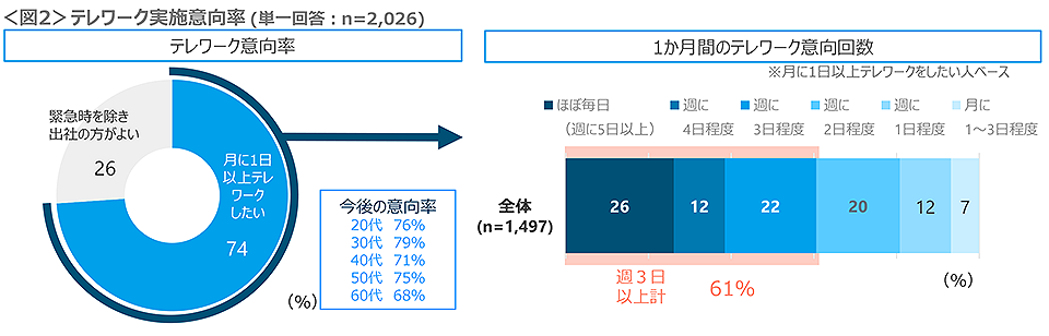 首都圏有職者のうち、今までにテレワークを経験した人は61%。まん延防止等重点措置期間中である、直近1か月のテレワーク実施率は49%と半数であった。年代別には、20代の1か月間の実施率は52%とやや他の年代より高めではあるものの、年代によるテレワーク実施率に大きな差は見られない。この1か月間のテレワーク実施回数は、「ほぼ毎日」が32%と最も多く、一週間の半分以上でテレワークをしている人(週3日以上)は、63%を占めた。今後、「月に1日以上テレワークをしたい」人は74%と高い。特に、30代の意向者は79%と目立つ。<図1、2>