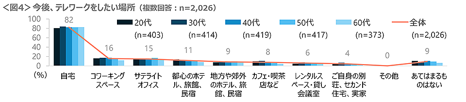 働く場所についてどちらを中心にしたいか聴取したところ、「会社や現場」が58%、「テレワーク」が43%。「会社や現場」を中心に働きたいは60代のみで6割を超えた。「会社や現場」で働きたい人の理由(自由回答)は、「会社の方が仕事に集中できる/効率が良い」「コミュニケーションが取りやすい」「onとoffの切り替え/メリハリをつける/公私を分ける」という意見があがった。一方、「テレワーク」 で働きたい人の理由は、「移動時間がもったいない/その時間を有効に使いたい」「満員電車の通勤はストレス/苦痛」「プライベート時間が取れる/時間にゆとりができる」など、首都圏調査ということもあり、オフィスに対しての不満ではなく、移動時間の長さや満員電車への不満が多くあがっていた。仮にテレワークを行うのであれば、どんな場所がよいかを聴取したところ「自宅」が82%と断トツで高く、次いで「コワーキングスペース」「サテライトオフィス」が続いた。<図3、4>
