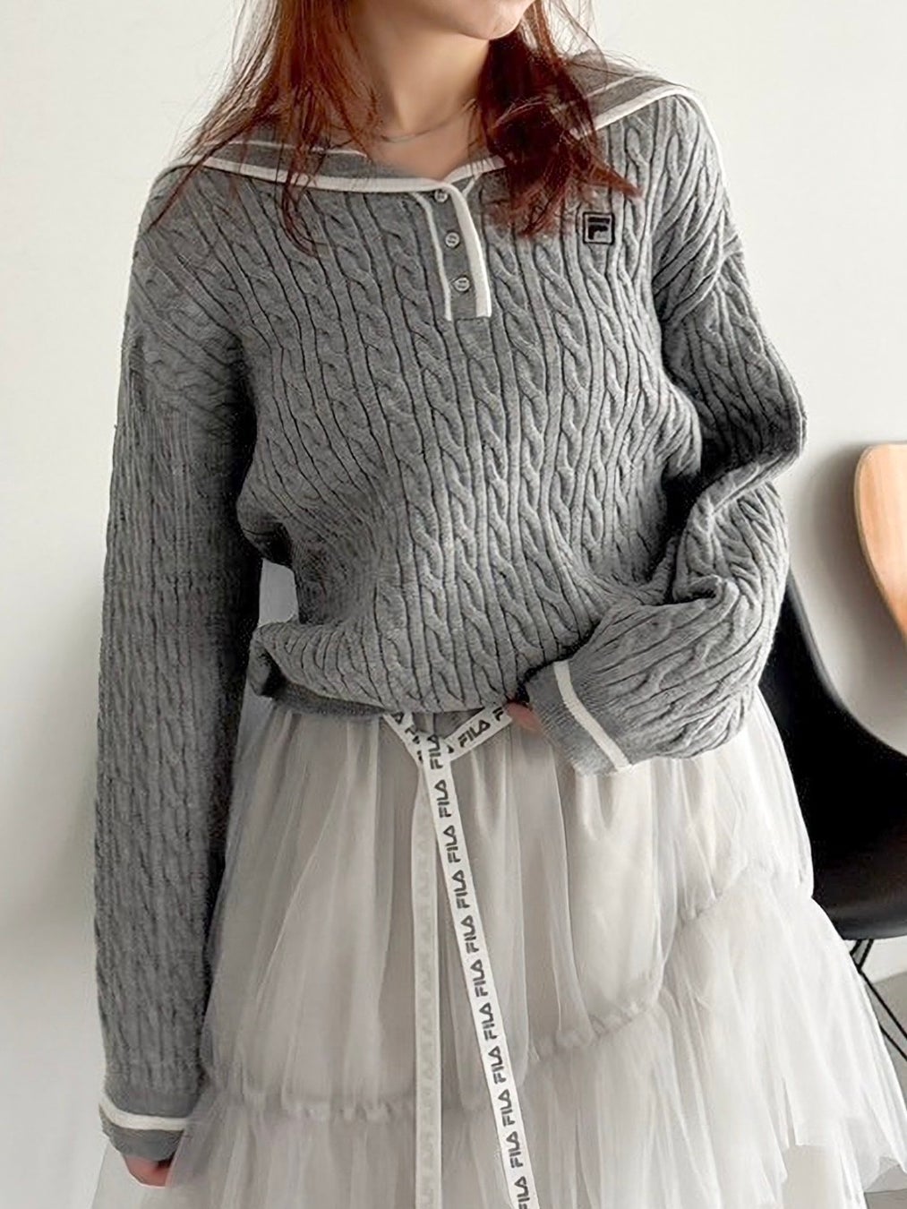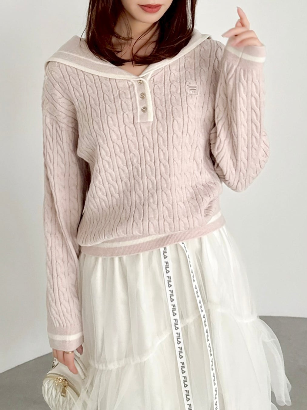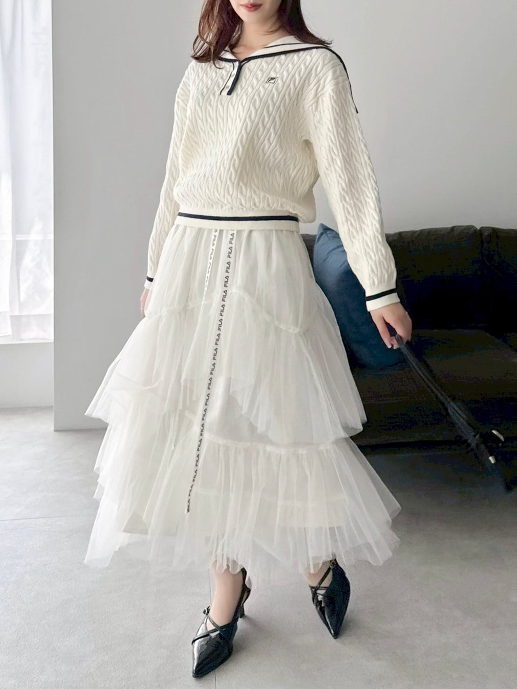 セーラーカラーやチュールスカートなどフェミニンな要素を引き立てるディテールに、FILAらしいロゴ使いやスポーティな配色をMIXしました。