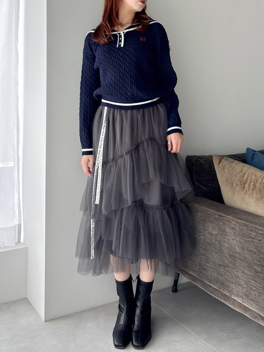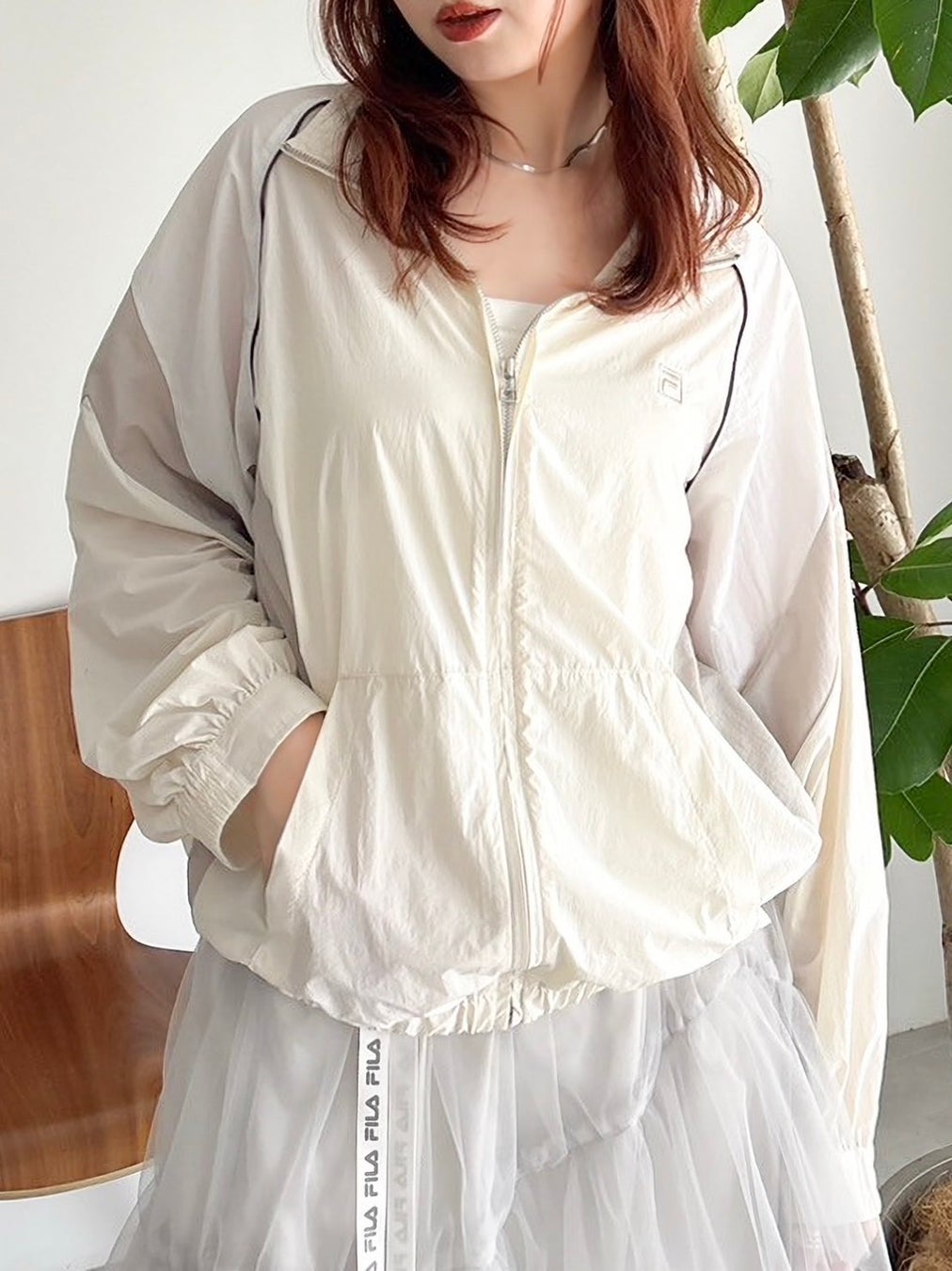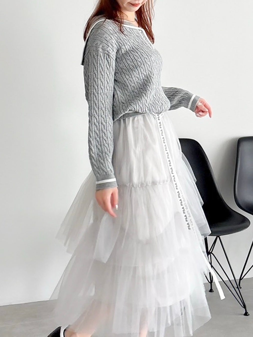セーラーカラーやチュールスカートなどフェミニンな要素を引き立てるディテールに、FILAらしいロゴ使いやスポーティな配色をMIXしました。