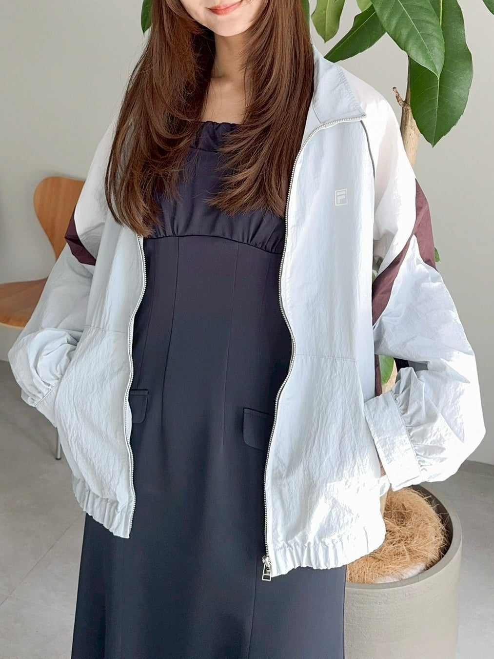 パウダリーなバイカラー配色で甘さとクールさをミックスし、カジュアルに見えがちなブルゾンを“上品スポーティ”に昇華させた一枚です。