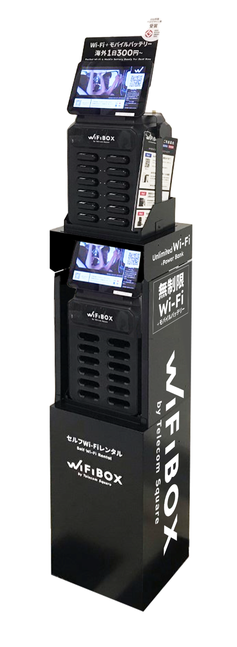 「WiFiBOX」は、当社が2022年4月1日にリリースしたWi-Fiレンタルの新サービスで、事前予約がなくとも即時予約・受取・使用開始が可能なシェアリング型サービスです(特許出願中)。日本国内プランは1日840円(税込価格)で無制限の利用ができるうえ、端末には充電用ケーブルが格納されモバイルバッテリー機能も搭載、スマートフォンの充電を行うことも可能です。コロナ禍での非対面ニーズへの対応やユーザーにとって煩わしい手続き・行列待ちの排除、運営コストの削減、設置場所の余剰スペース確保など多方面での複合的効果をもたらすサービスデザインが高く評価されたことから、2022年度グッドデザイン賞を受賞いたしました。