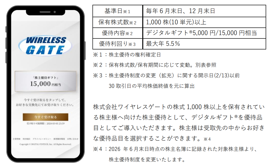 株式会社ワイヤレスゲート(代表取締役CEO:成田 徹、東証スタンダード:証券コード 9419)において、株式会社デジタルプラス(代表取締役社長:菊池 誠晃、本社:東京都渋谷区、東証グロース市場:証券コード3691)グループが運営する「デジタルギフト®」を株主優待としてご活用いただくことになりました。