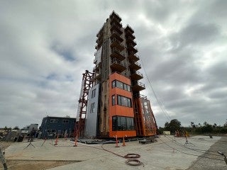 AQ Groupは特に、耐震に対しては強いこだわりを持っています。これまでに幾度となく実物大の建物を使った耐震実験、倒壊実験を実施。2022年には世界初の木造軸組工法による5階建て純木造ビルの実物耐震実験を行ったのち、免震構造ではなく耐震構造の純木造5階建てモデルハウスをオープンさせています。さらに、アメリカで実施された世界初10階建木造ビル振動実験の共同研究にも参画。そして、2024年3月には耐震構造の純木造8階建て本社ビルを完成させています。