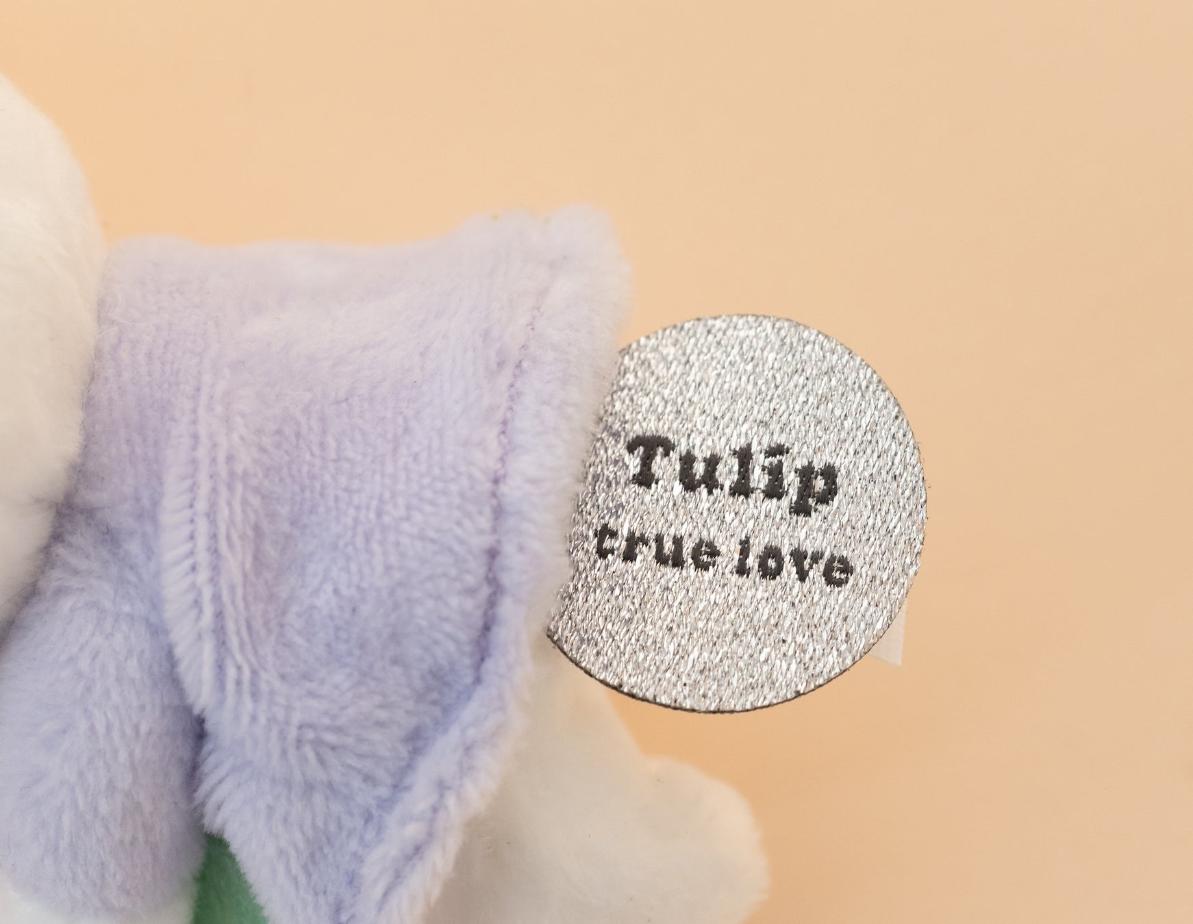 商品についているクラフト製の紙タグには「ミッフィー」が持っている花にまつわる花言葉がプリントされており、贈り主の気持ちを代弁するメッセージカードとして使用することができます。記載されている花言葉は、「ディック・ブルーナ」公式の「ミッフィーのお花屋さん フラワーミッフィー」に監修していただきました。また、商品の織りネームにも花言葉が刺繍されています。