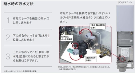 ハイブリッド給湯器「ECO ONE X5」は、災害時に断水してもタンク内のお湯・水を非常用として利用できます。さらに、停電時でもガスさえ供給されていれば、家庭用ポータブル電源や太陽光発電の自立運転機能を使ってお湯の供給が可能です。