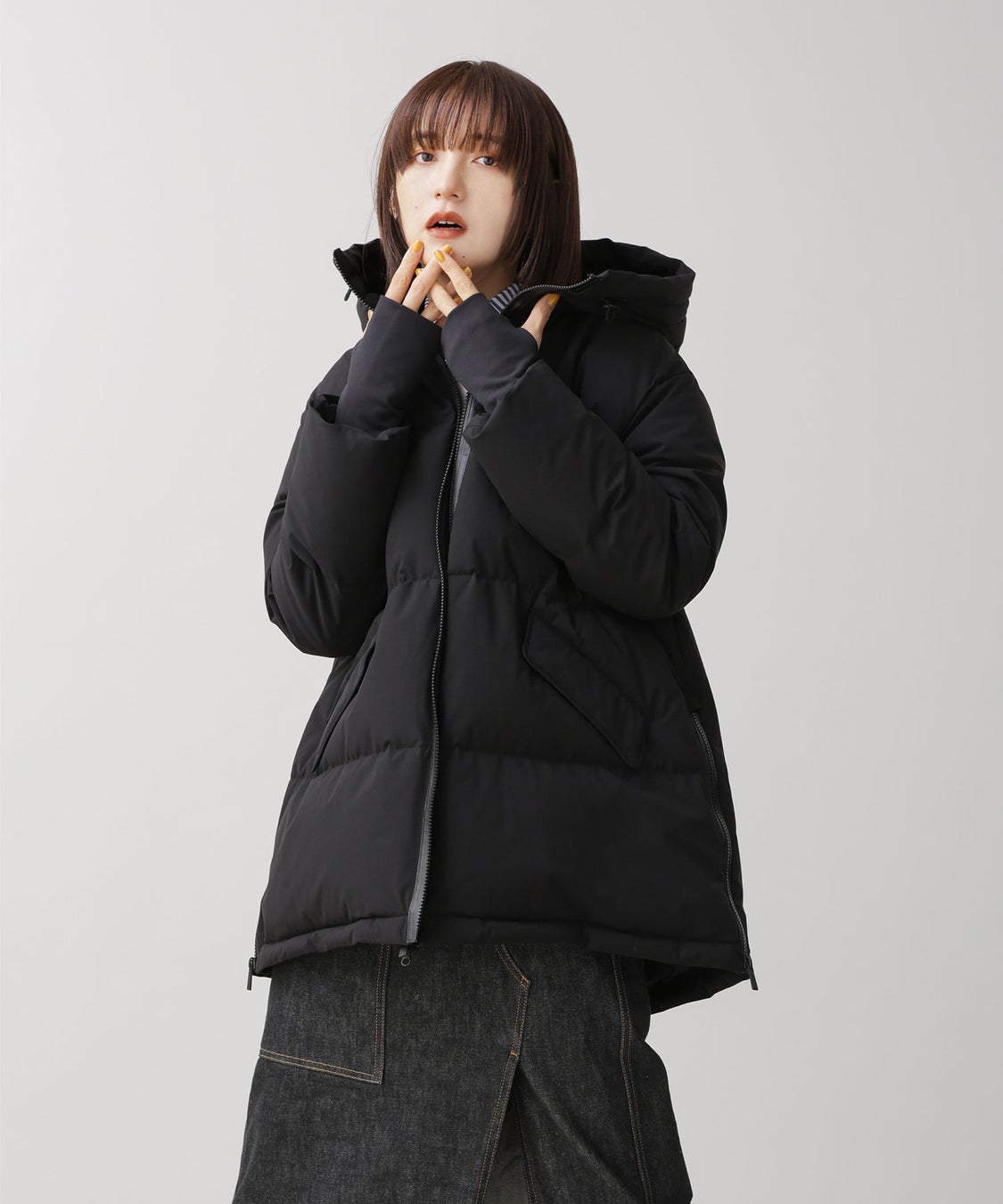 スポーティなデザインの中に女性らしいディテールを取り入れたAラインダウン。ミドル丈のバランスや袖口のスポーティなリブ使い、配色附属使いなど、今っぽい都会的なルックスに仕上げている。撥水、防風性の高いハイスペックな機能素材も魅力。